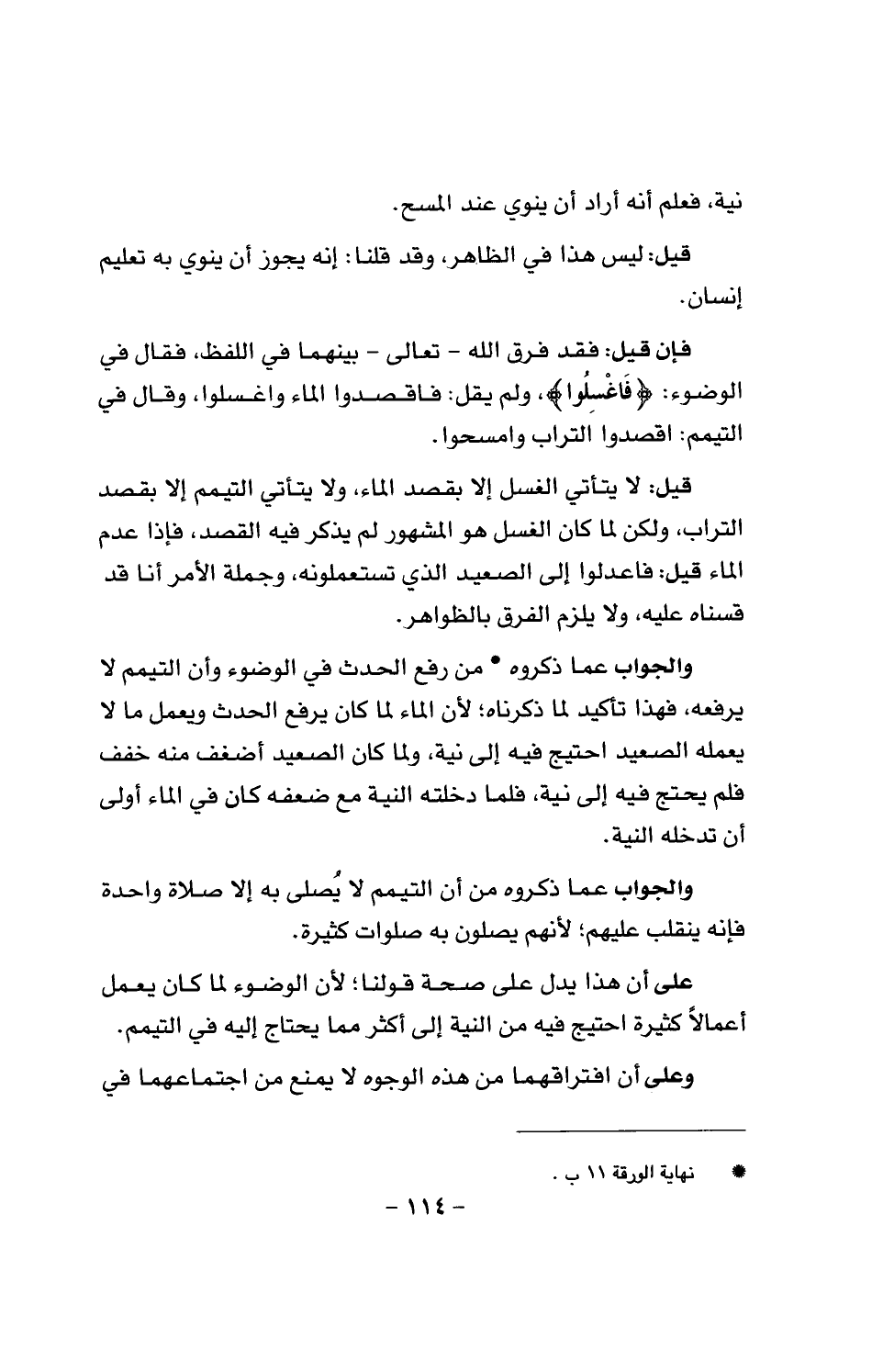 والجواب عما ذكروه من رفع الحدث في الوضوء وان التيمم لا يرفعه، فهذا تأكيد لما ذكرناه؛ لأنَّ الماء لما كان يرفع الحدث ويعمل ما لا يعمله الصعيد احتيج فيه إلى نية، ولما كان الصعيد أضعف منه خفف فلم يحتج فيه على نية، فلما دخلته النية مع ضعفه كان في الماء أولى أن تدخله النية.