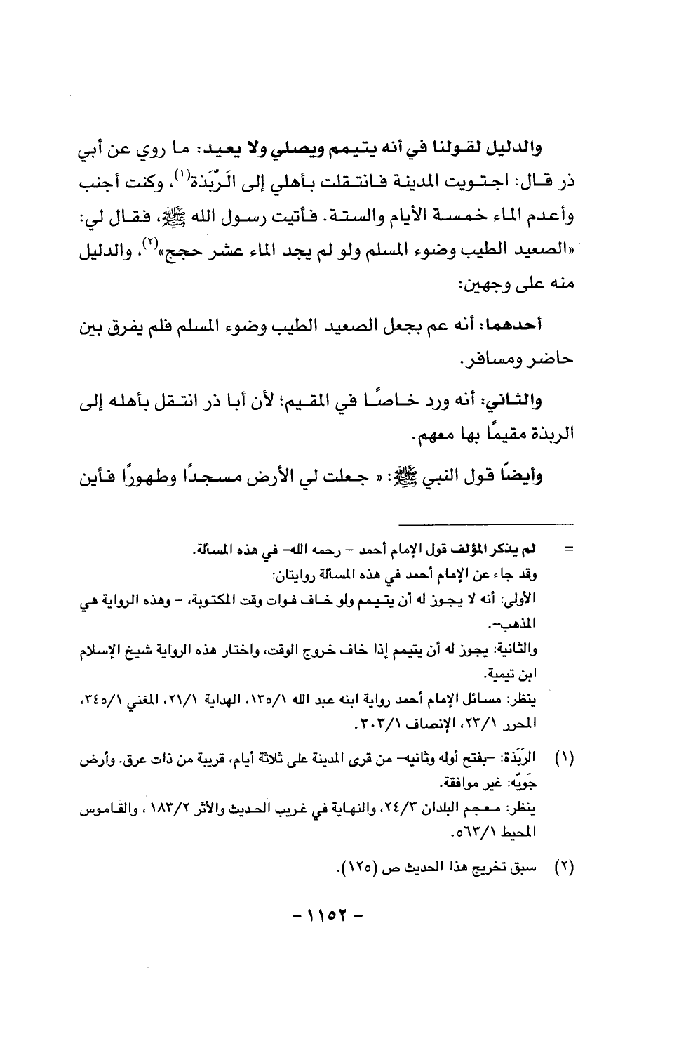 والدليل لقولنا في أنه التيمم ويصلي ولا يعيد: ما روي عن أبي ذر قال: اجتويت المدينة فانتقلت بأهلي إلى الربذة، وكنت أجنب وأعدم الماء خمسة الأيام والستة. فأتيت رسول الله صَلَّى اللَّهُ عَلَيْهِ وَسَلَّمَ، فقال لي: «الصعيد الطيب وضوء المسلم ولو لم يجد الماء عشر حجج»، والدليل منه على وجهين: