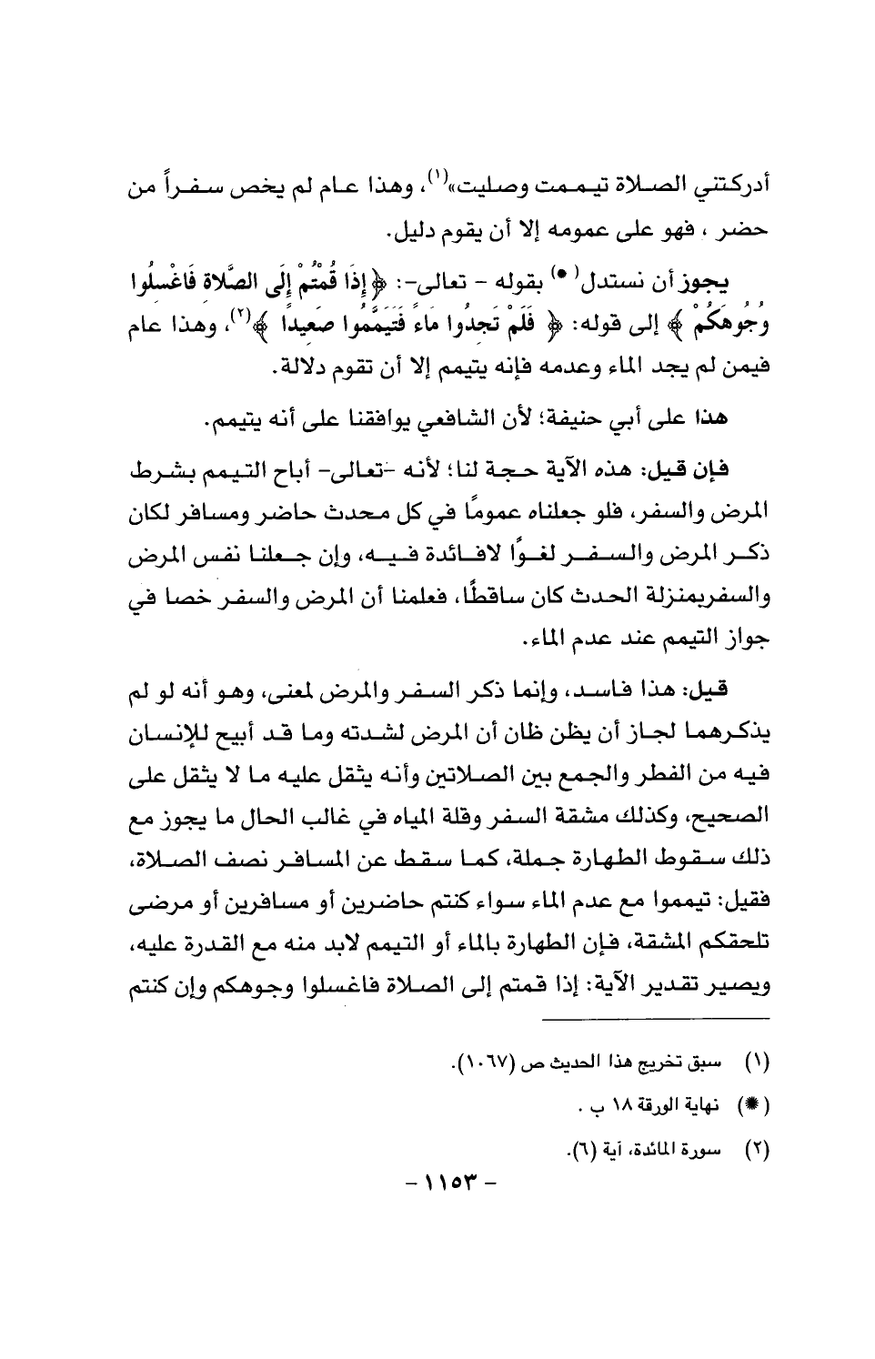 قيل: هذا فاسد، وإنما ذكر السفر والمرض لمعنى، هو أنه لو لم يذكرهما لجاز أن يظن ظان أن المرض لشدته وما قد أبيح للإنسان فيه من الفطر والجمع بين الصلاتين وأنه يثقل عليه ما لا يثقل على الصحيح، وكذلك مشقة السفر وقلة المياه في غالب الحال ما يجوز مع ذلك سقوط الطهارة جملة، كما سقط عن المسافر نصف الصلاة، فقيل: تيمموا مع عدم الماء سواء كنتم حاضرين أو مسافرين ومرضى تلحقكم المشقة، فإن الطهارة بالماء أو التيمم لا بد منه مع القدرة عليه، ويصير تقدير الآية: قمتم إلى الصلاة فاغسلوا وجوهكم وإن كنتم