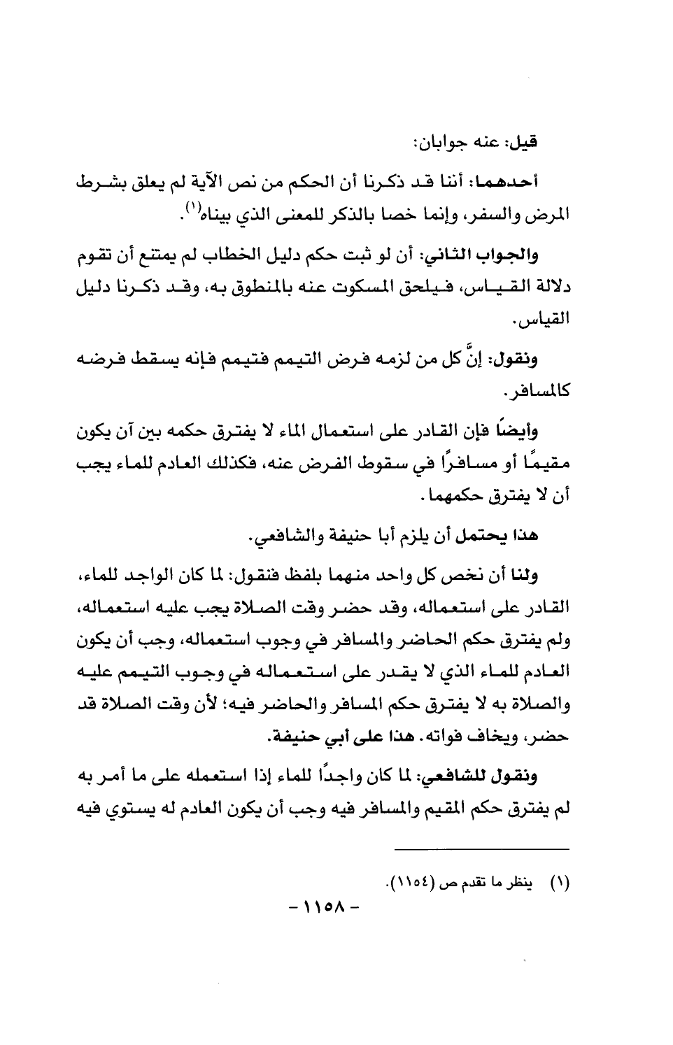 ولنا أن نخص كل واحد منهما بلفظ فنقول: لما كان الواجد للماء، القادر على استعماله، وقد حضر وقت الصلاة يجب عليه استعماله، ولم يفترق حكم الحاضر والمسافر في وجوب استعماله، وجب أن يكون العام للماء الذي لا يقدر على استعماله في جب التيمم عليه والصلاة به لا يفترق حكم المسافر والحاضر فيه؛ لأن وقت الصلاة قد حضر، ويخاف فواته. هذا على أبي حنيفة.
