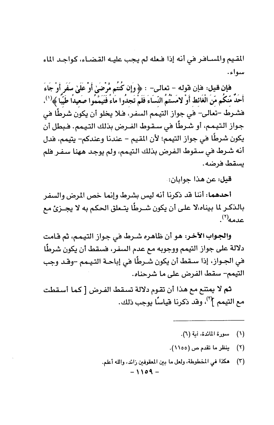 والجواب الآخر: هو أن ظاهره شرط في جواز التيمم، ثم قامت دلالة على جواز التيمم ووجوبه مع عدم السفر، فسقط أن يكون شرطا في الجواز، إذا سقط أن يكون شرطا في إباحة التيمم - وقد وجب التيمم - سقط الفرض على ما شرحناه.