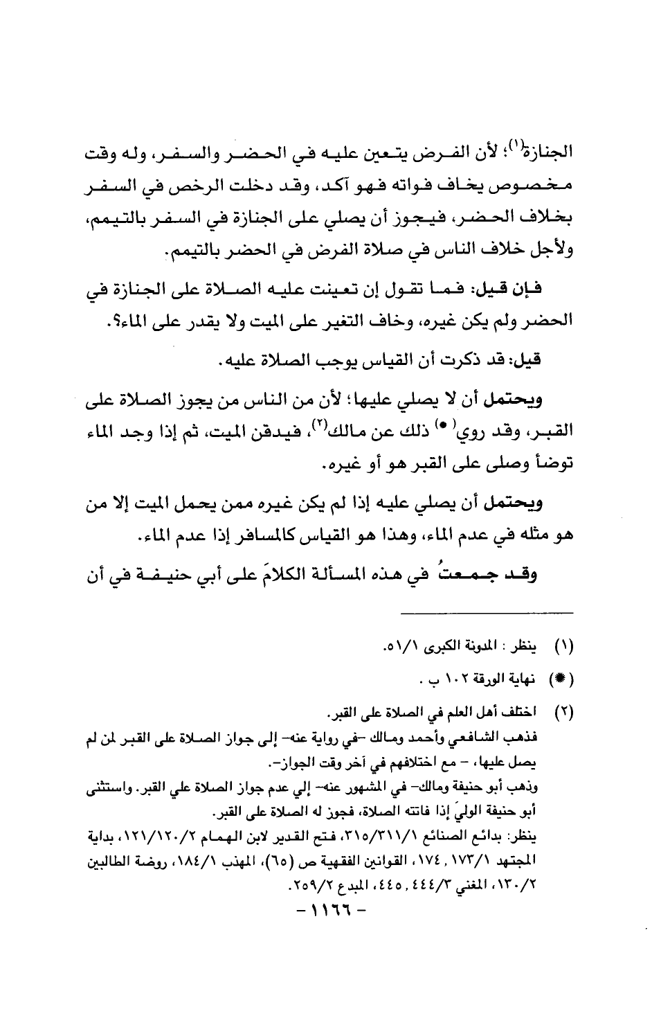 فإن قيل: فما تقول إن تعينت عليه الصلاة على الجنازة في الحضر ولم يكن غيره، وخاف التغير على الميت ولا يقدر على الماء؟.