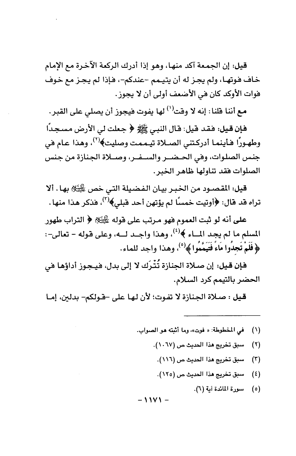 فإن قيل: فقد قيل: قال النبي صَلَّى اللَّهُ عَلَيْهِ وَسَلَّمَ: «جعلت علي الأرض مسجدا وطهورا فأينما أدركتني الصلاة تيممت وصليت»، وهذا عام فقي جنس الصلوات، وفي الحضر والسفر، وصلاة الجنازة من جنس الصلوات فقد تناولها ظاهر الخبر.