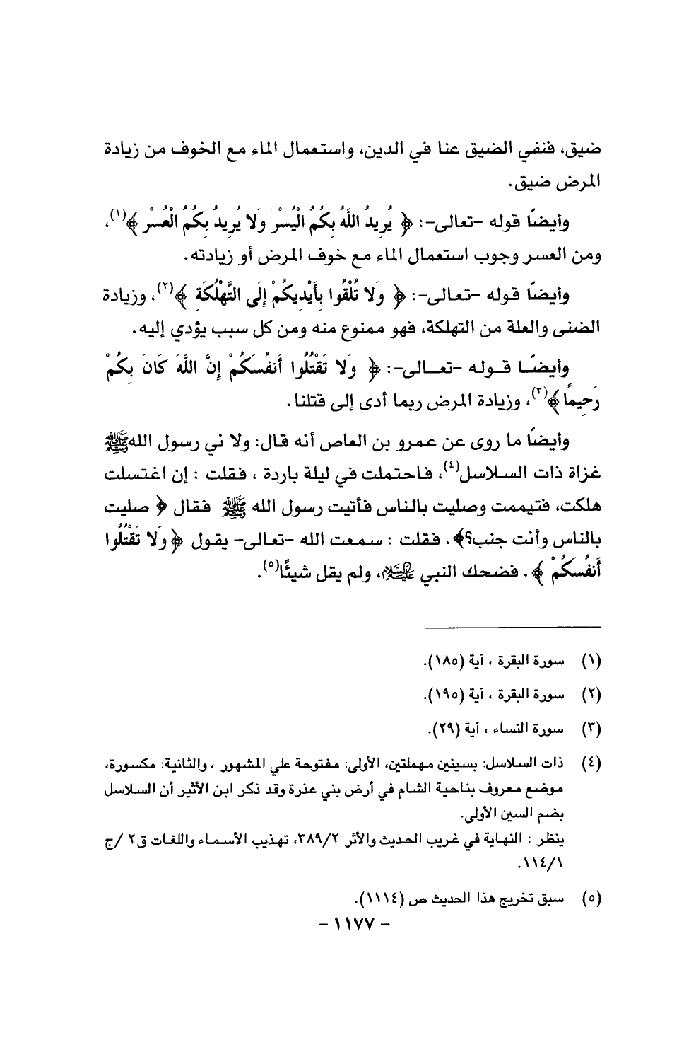 وأيضا ما روى عن عمر بن العاص أنه قال: ولاني رسول الله صَلَّى اللَّهُ عَلَيْهِ وَسَلَّمَ غزاة ذات السلاسل، فاحتملت في ليلة باردة، فقلت: إن اغتسلت هلكت، فتيممت وصليت بالناس فأتيت رسول الله صَلَّى اللَّهُ عَلَيْهِ وَسَلَّمَ فقال «صليت بالناس وأنت جنب». فقلت: سمعت الله - تعالى - يقول {ولا تقتلوا أنفسكم}. فضحك النبي عليه السلام، لم يقل شيئا.
