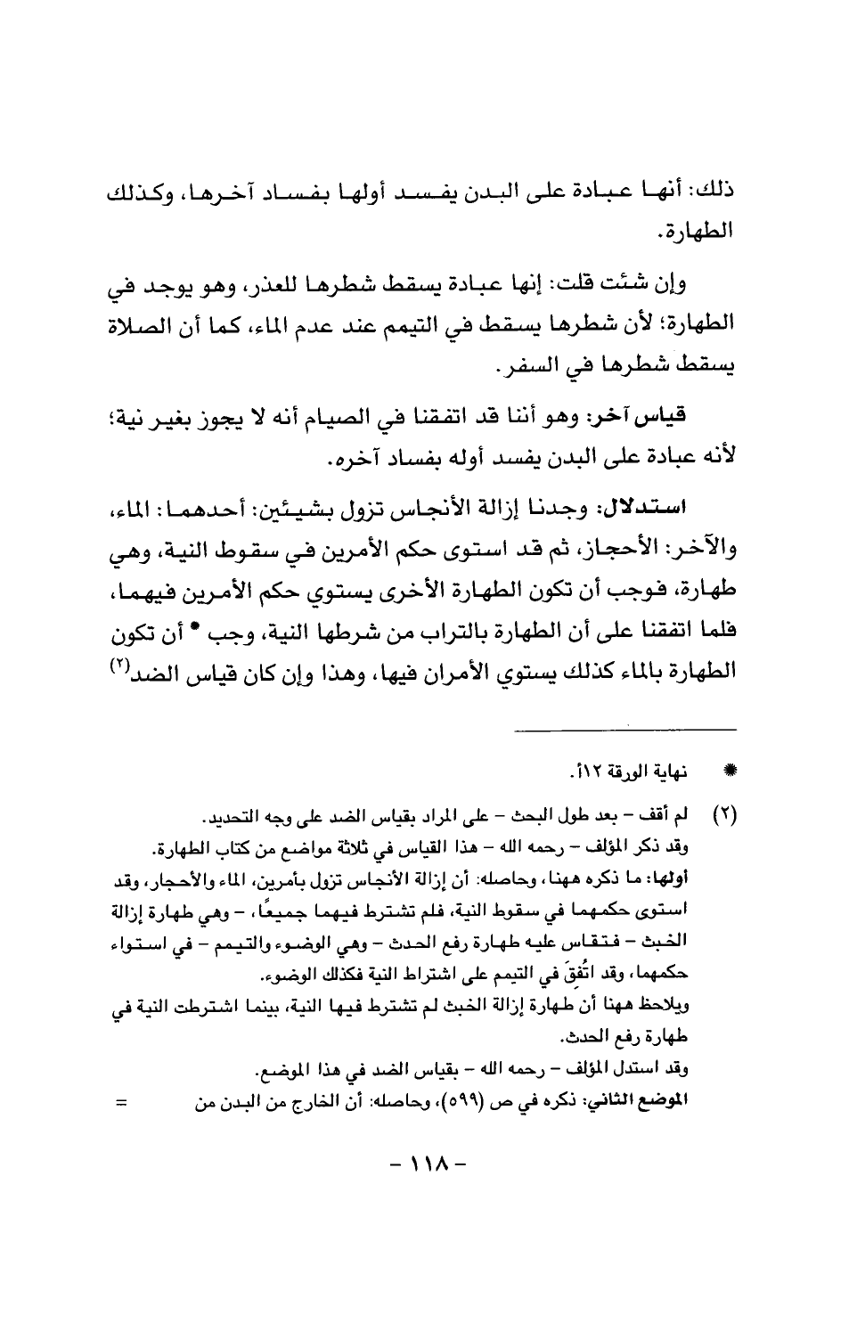 استدلال: وجدنا إزالة الأنجاس تزول بشيئين: أحدهما: الماء، والآخر: الأحجاز، ثم قد استوى حكم الأمرين في سقوط النية، وهي طهارة، فوجب أن تكون الطهارة الأخرى يستوي حكم الأمرين فيهما، فلما اتفقنا على أن الطهارة بالتراب من شرطها النية، وجب أن تكون الطهارة بالماء كذلك يستوي الأمران فيها، وهذا وإن كان قياس الضد