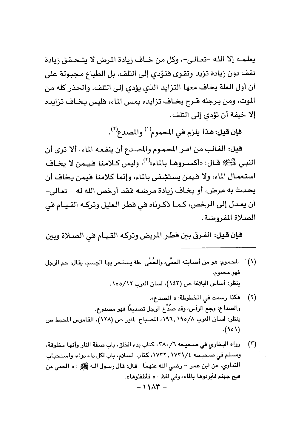 قيل: الغالب من أمر المحموم المصدع أن ينفعه الماء. ألا ترى أن النبي عليه السلام قال: «اكسروها بالماء»، وليس كلامنا فيمن لا يخاف استعمال الماء، ولا فيمن يستشفى بالماء، وإنما كلامنا فيمن يخاف أن يحدث به مرض، أو يخاف زيادة مرضه فقد أرخص الله له - تعالى - أن يعدل إلى الرخص، كما ذكرناه في فطر العليل وتركه القيام في الصلاة المفروضة.