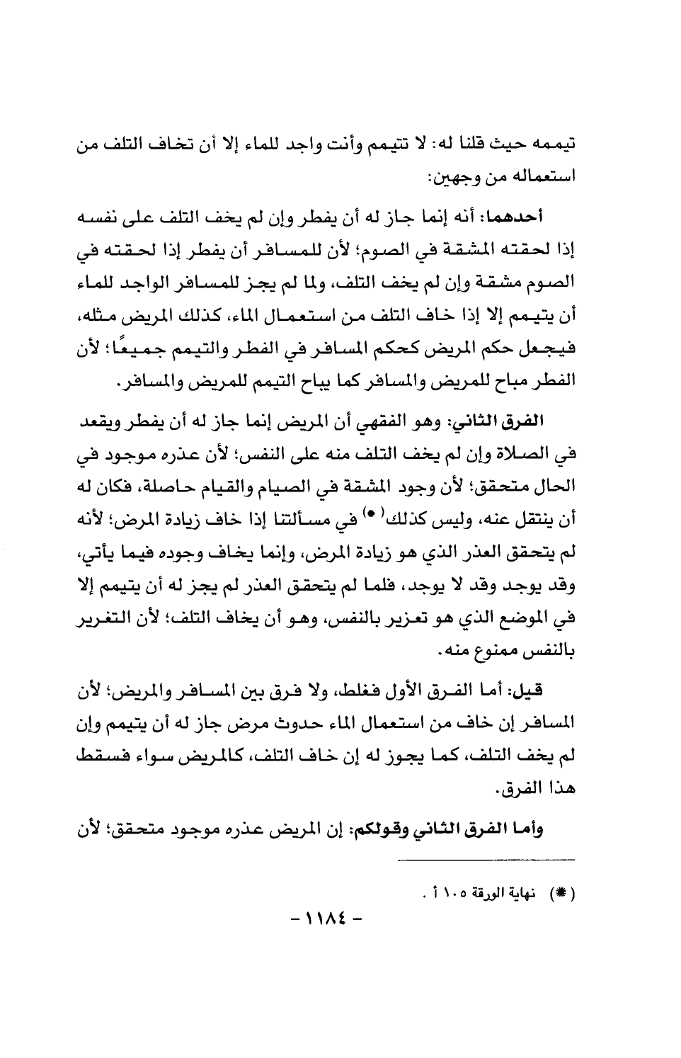 الفرق الثاني: وهو الفقهي أن المريض إنما جاز له أن يفطر ويقعد في الصلاة عن لم يخف التلف منه على النفس؛ لأن عذره موجود في الحال متحقق؛ لأن وجود المشقة في الصيام والقيام حاصلة، فكان له أن ينتقل عنه، وليس كذلك في مسألتنا إذا خاف زيادة المرض؛ لأنه لم يتحقق العذر الذي هو زيادة المرض، وإنما يخاف وجوده فيما يأتي، وقد يوجد وقد لا يوجد، فلما لم يتحقق العذر لم يجز له أن يتمم إلا في الموضع الذي هو تعزير بالنفس، وهو أن يخاف التلف؛ لأن التغرير بالنفس ممنوع منه.