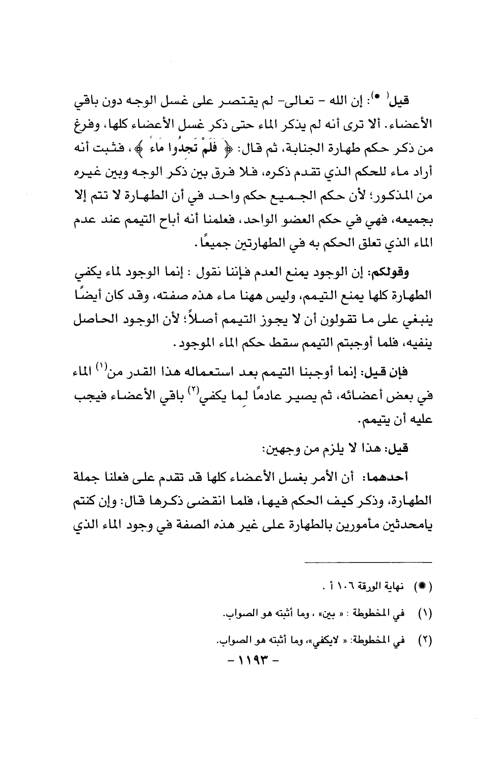 وقولكم: إن الوجود يمنع العدم فإننا نقول: إنما الوجود لماء يكفي الطهارة كلها يمنع التيمم، وليس ها هنا ماء هذه صفته، وقد كان أيضا ينبغي على ما تقولون أن لا يجوز التيمم أصلا؛ لأن الوجد الحاصل ينفيه، لما أوجبتم التيمم سقط حكم الماء الموجود.