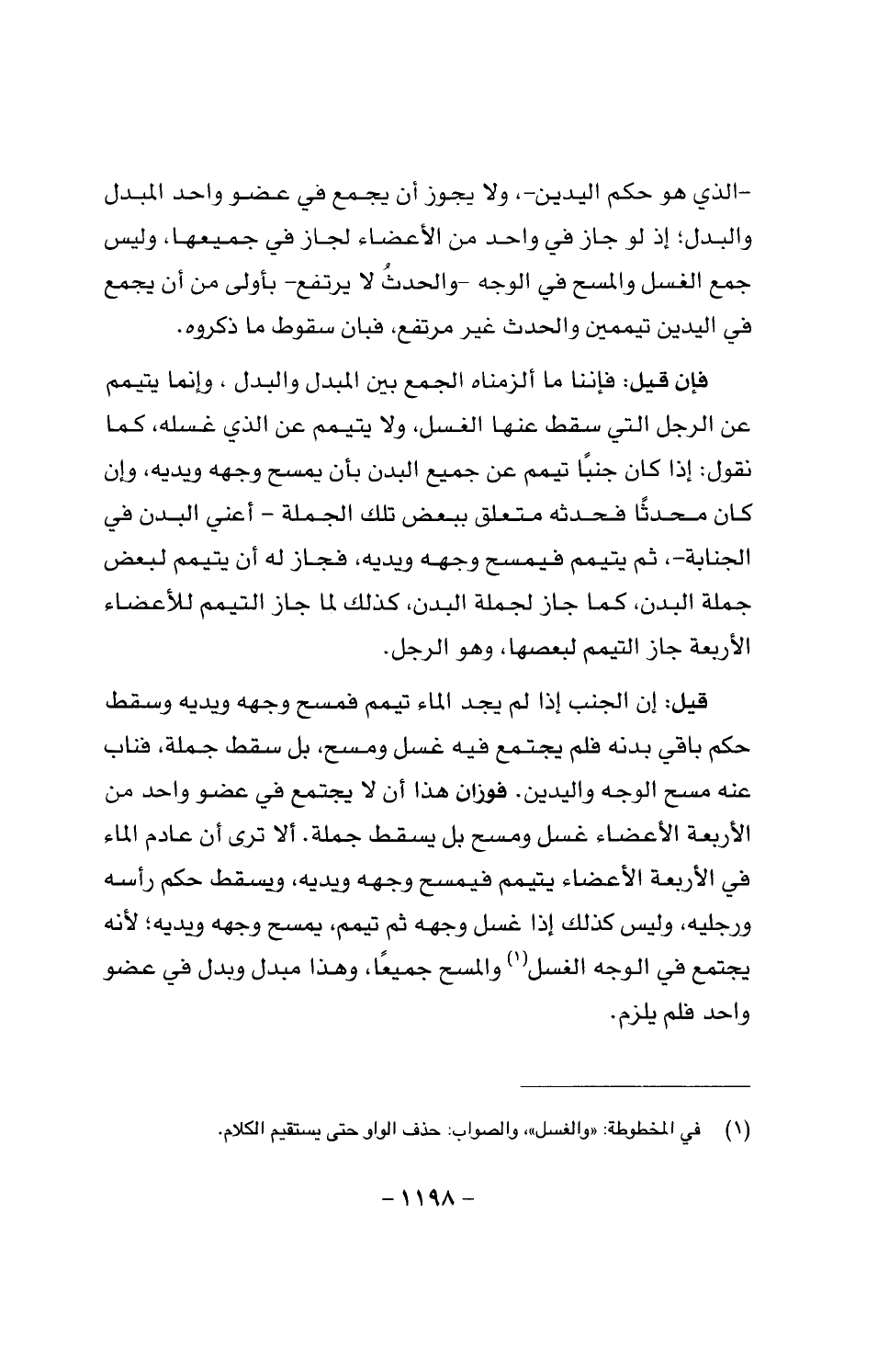 قيل: إن الجنب إذا لم يجد الماء تيمم فمسح وجهه ويديه سقط حكم باقي بدنه فلم يجتمع فيه غسل ومحس، بل سقط جملة، فناب عنه مسح الوجه واليدين. فوزان هذا أن لا يجتمع ي عضو واحد من الأربعة الأعضاء يتيمم فيمسح وجهه ويديه، يسقط حكم رأسه رجليه، ليس كذل إذا غسل وجهه ثم تيمم، يمسح وجهه ويديه، لأنه يجتمع في الوجه الغسل المسح جميعا، وهذا مبدل وبدل في عضو واحد فلم يلزم.