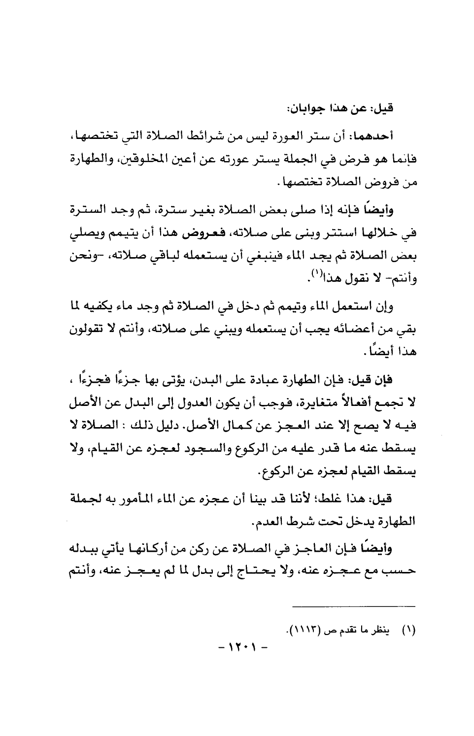 قيل: ... هذا غلط؛ لأننا قد بينا أن عجزه عن الماء المأمور به لجملة الطهارة يدخل تحت شرط العدم.