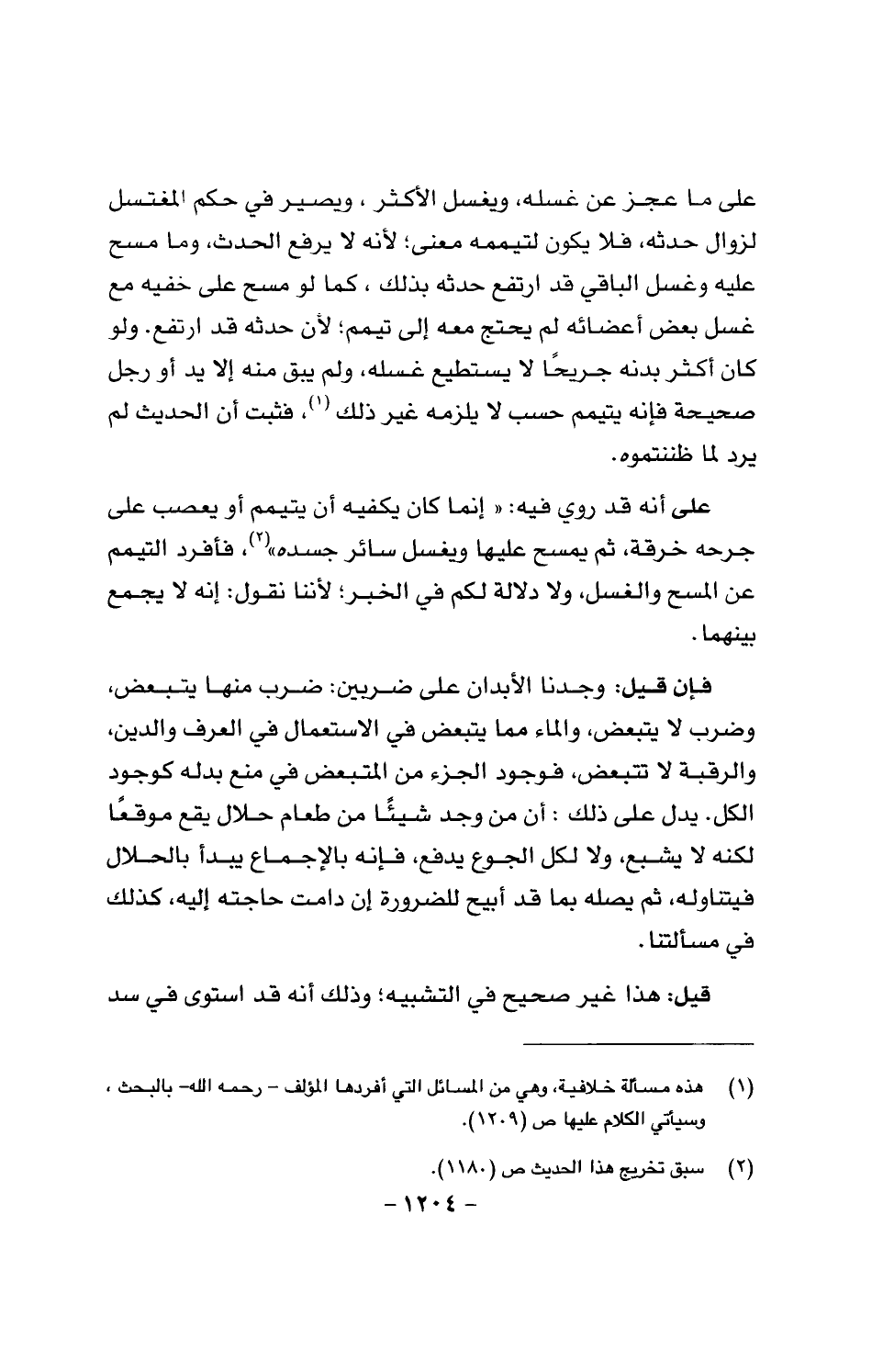 على أنه قد روي فيه: «إنما كان يكفيه أن يتيمم أو يعصب على جرحه خرقة، ثم يمسح عليها ويغسل سائر جسده»، فأفرد التيمم عن المسح والغسل، لا دلالة لكم في الخبر؛ لأننا نقول: إنه لا يجمع بينهما.