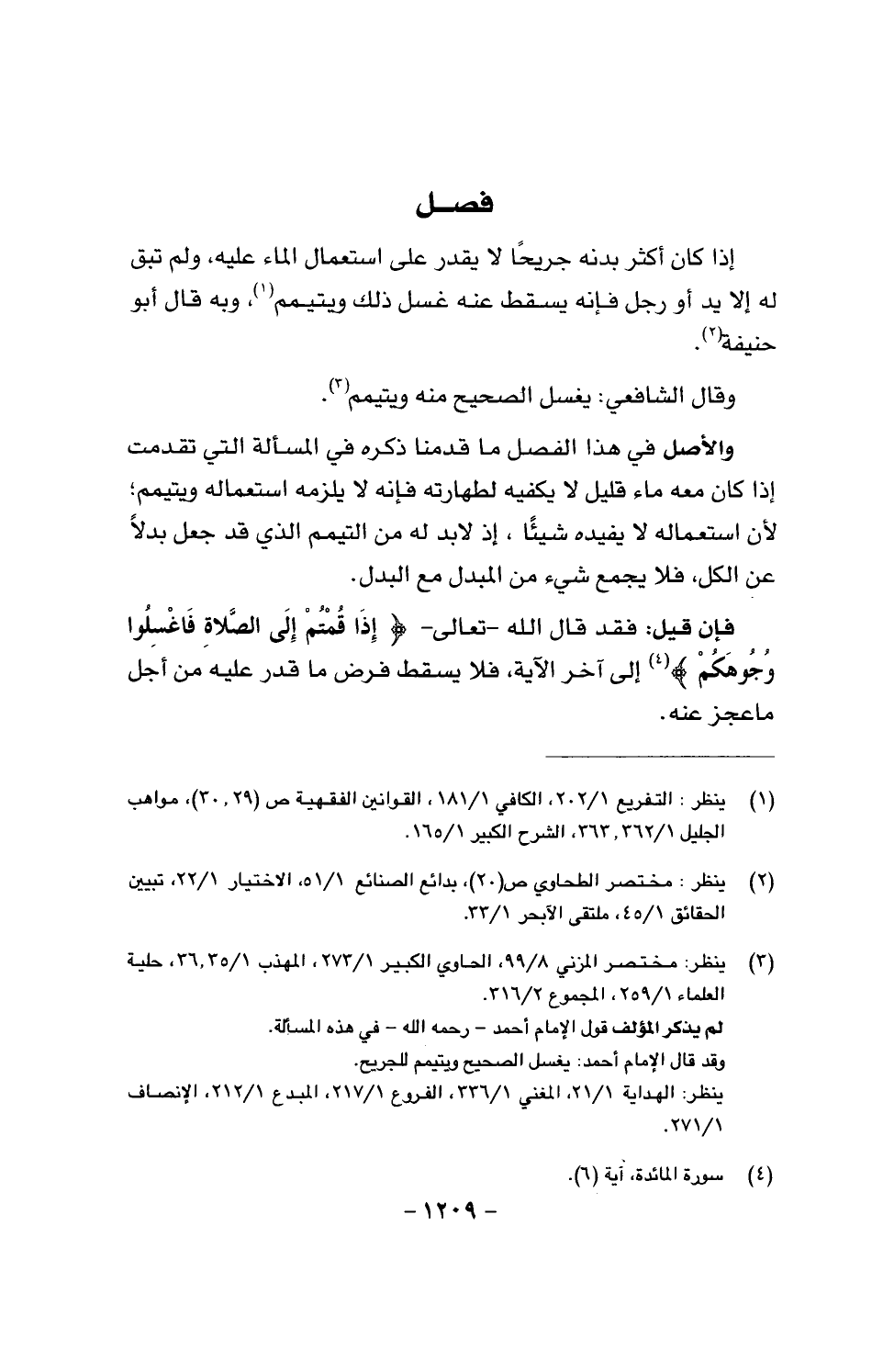 إذا كان أكثر بدنه جريحا لا يقدر على استعمال الماء عليه، ولم تبق له إلا يد ورجل فإنه يسقط عنه غسل ذلك ويتيمم، وبه قال أبو حنيفة.
