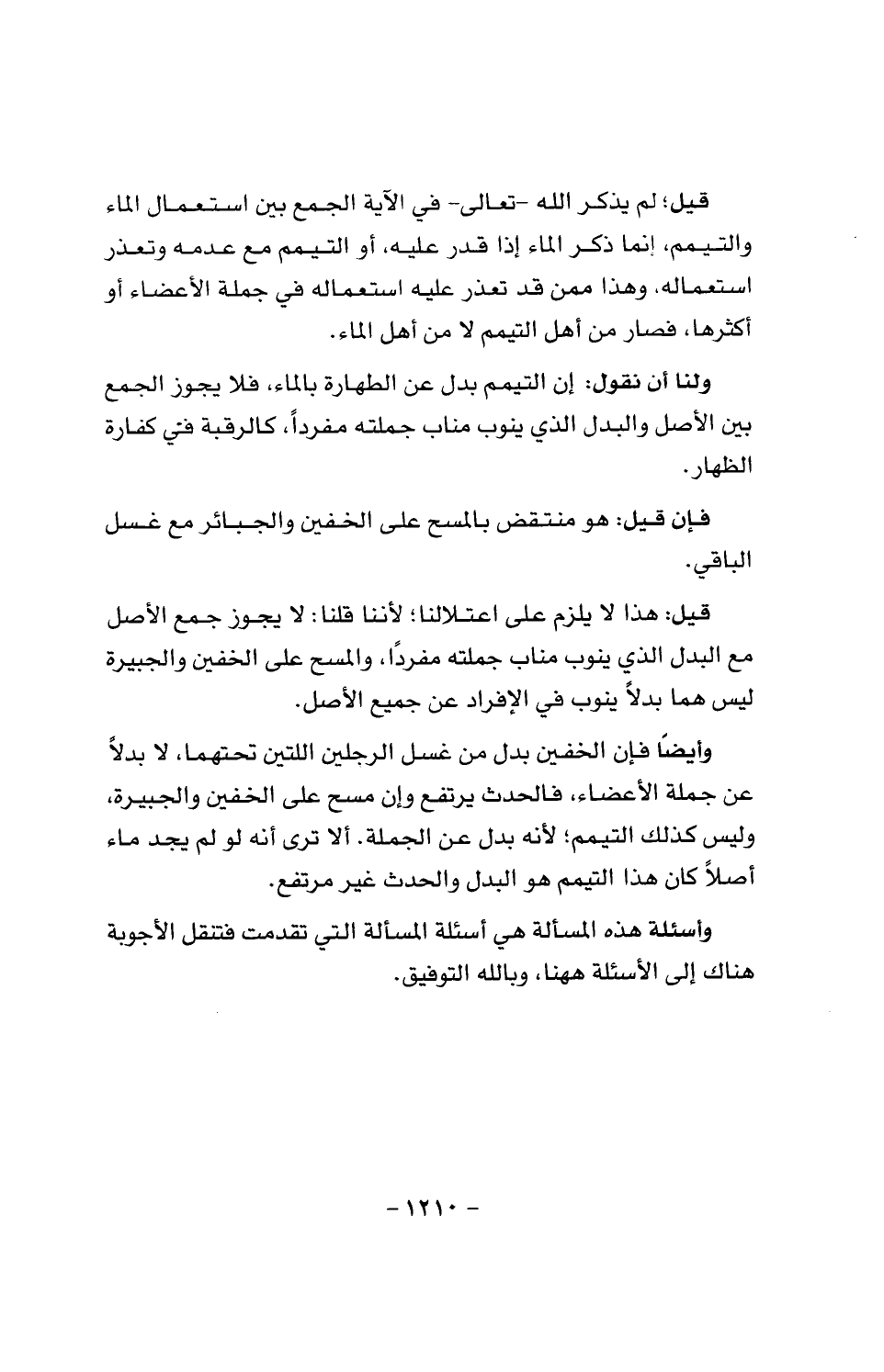 قيل: هذا لا يلزم على اعتلالنا؛ لأننا قلنا: لا يجوز جمع الأصل مع البدل الذي ينوب مناب جملته مفردا، والمسح على الخفين والجبيرة ليس هما بدلا ينوب في الإفراد عن جميع الأصل.