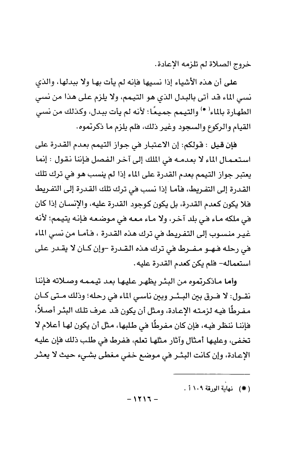 فإن قيل: قولكم: إن الاعتبار في جواز التيمم بعدم القدرة على استعمال الماء لا بعدمه في الملك إلى آخر الفصل فإننا نقول: إنما يعتبر جواز التيمم بعدم القدرة على الماء إذا لم ينسب هو في ترك تلك القدرة إلى التفريط. فأما إذا نسب في ترك تلك القدرة إلى التفريط فلا يكن كعدم القدرة، بل يكن كوجود الدرة عليه، والإنسان إذا كان في ملكه ماء في بلد آخر، ولا ماء معه في موضعه فإنه يتيمم؛ لأنه غير منسوب إلى التفريط في ترك هذه القدرة، فأما من نسي الماء في رحله فهو مفرط في ترك هذه القدرة - وإن كان لا يقدر على استعماله - فلم يكن كعدم القدرة عليه.