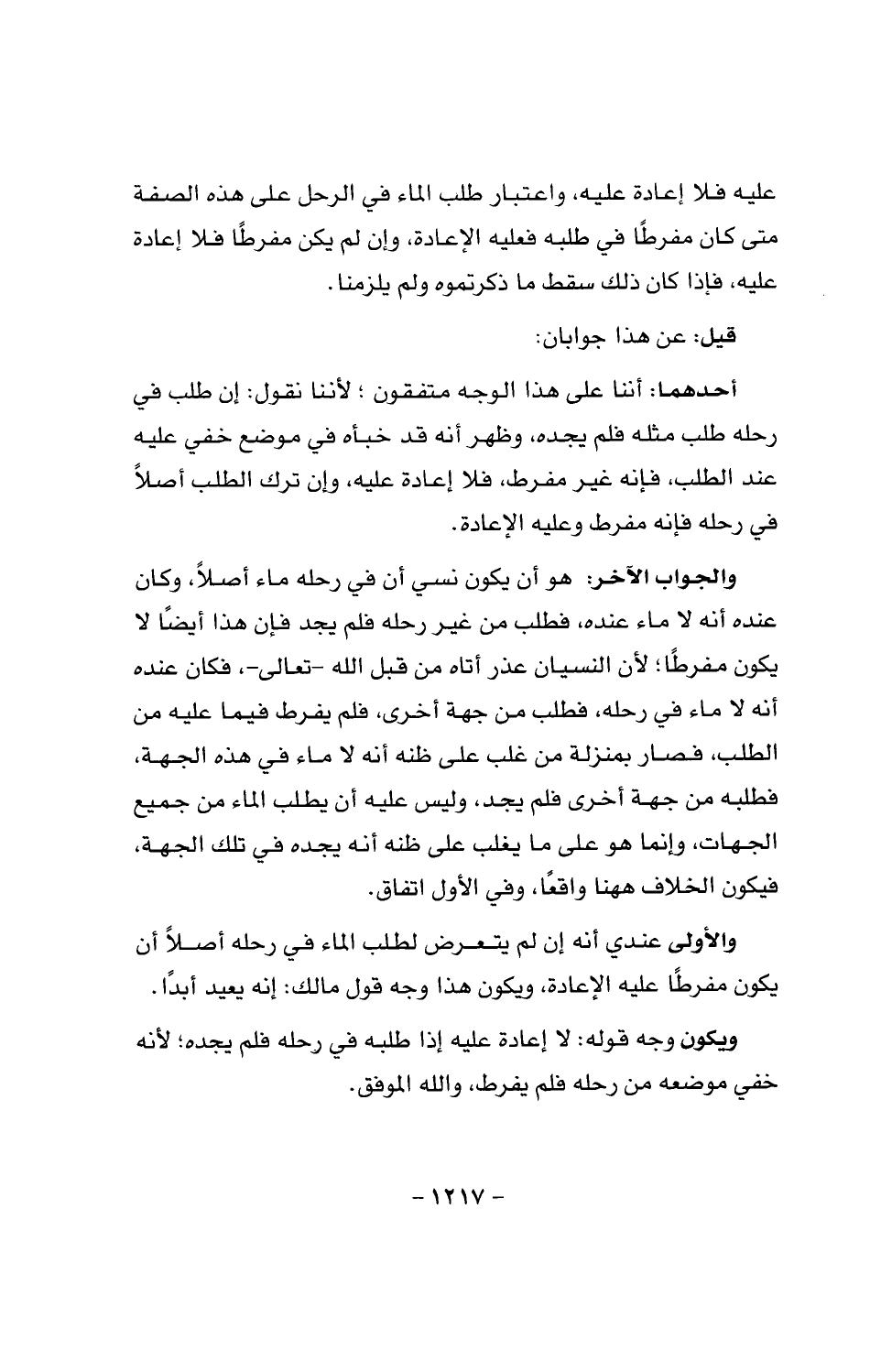 والأولى عندي أنه إن لم يتعرض لطلب الماء في رحله أصلا أن يكون مفرطا عليه الإعادة، ويكون ها وجه قول مالك: إنه يعيد أبدا.