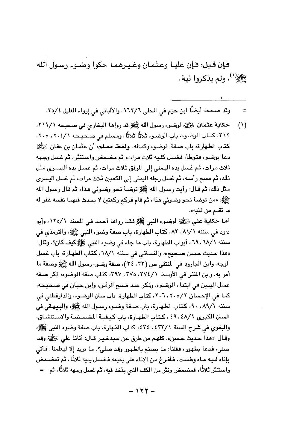فإن قيل: فإن عليًّا وعثمان وغيرهما حكوا وضوء رسول الله صَلَّى اللَّهُ عَلَيْهِ وَسَلَّمَ ولم يذكروا نية.
