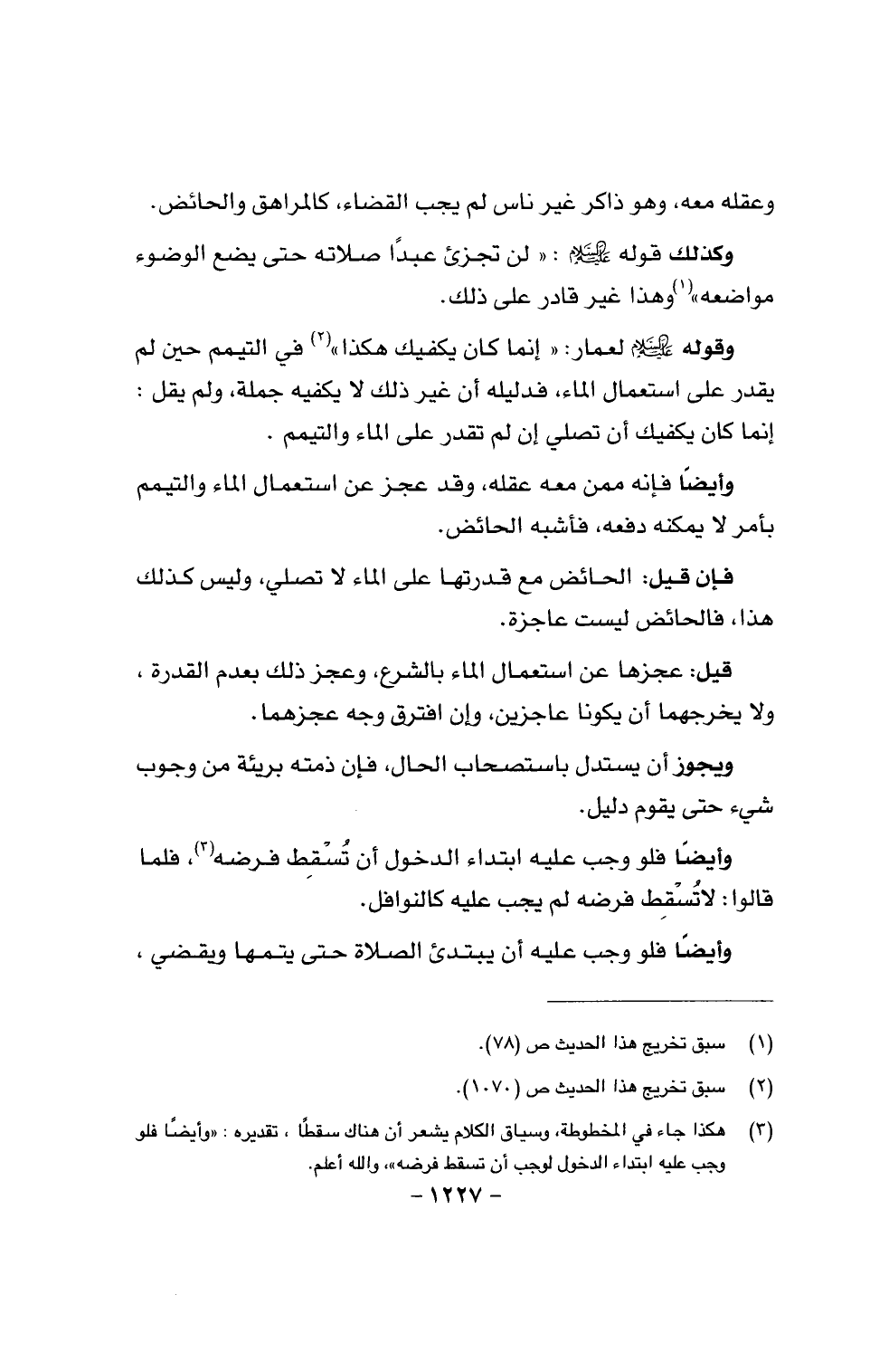 وكذلك قوله عليه السلام: «لن تجزئ عبدا صلاته حتى يضع الوضوء مواضعه» وهذا غير قادر على ذلك.