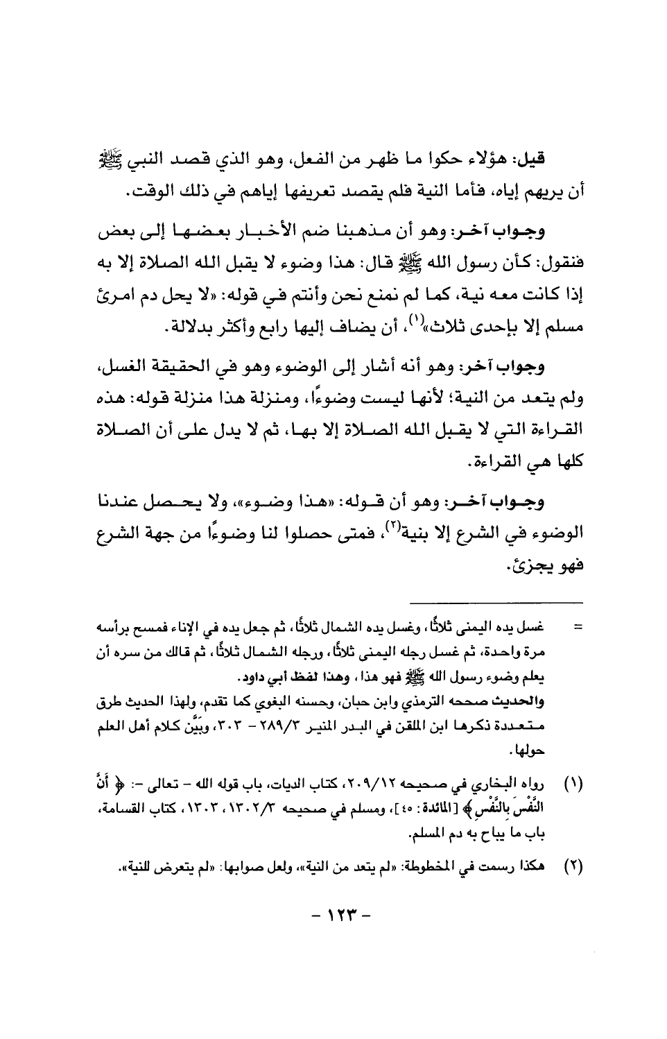 وجواب آخر: وهو أن مذهبنا ضم الأخبار بعضها إلى بعض فنقول: كان رسول الله صَلَّى اللَّهُ عَلَيْهِ وَسَلَّمَ قال هذا وضوء لا يقبل الله الصلاة إلا به إذا كانت معه نية، كما لم نمنع نحن وأنتم في قوله: «لا يحل دم امرئ مسلم إلا بإحدى ثلاث»، أن يضاف إليها رابع وأكثر بدلالة.