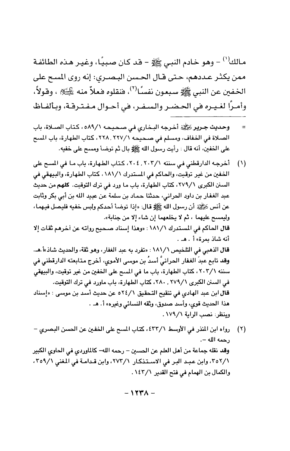 مالك - وهو خادم النبي صَلَّى اللَّهُ عَلَيْهِ وَسَلَّمَ - قد كان صبيا، وغير هذه الطائفة ممن يكثر عددهم، حتى قال الحسن البصري: إنه روي المسح على الخفين عن النبي صَلَّى اللَّهُ عَلَيْهِ وَسَلَّمَ سبعون نفسا، فنقلوه فعلا منه عليه السلام، وقولا، وأمرا لغيره في الحضر والسفر، في أحوال مفترقة، وبألفاظ