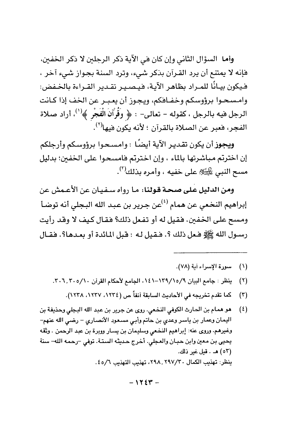 وأما السؤال الثاني عن كان في الآية ذكر الرجلين إلا ذكر الخفين، فإنه لا يمتنع أن يرد القرآن ذكر شيء، ترد السنة بجواز الشيء آخر.