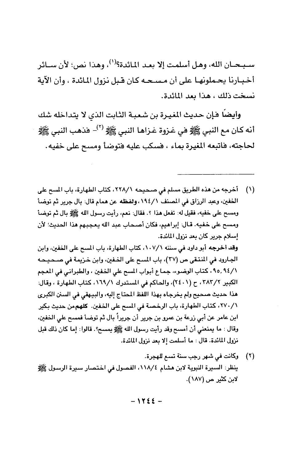 سبحان الله، وهل أسلمت إلا بعد المائدة، هذا نص: لأن سائر أخبارنا يحملونها على أن مسحه كان قبل نزول المائدة، وأن الآية نسخت ذلك، هذا بعد المائدة.