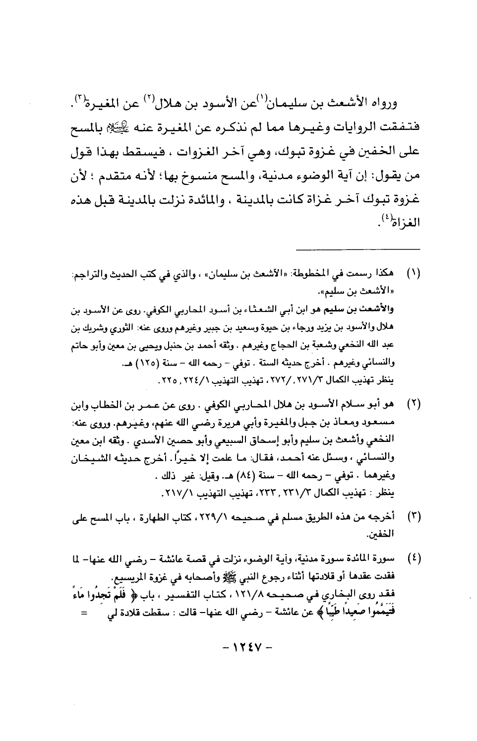 فتفقت الروايات وغيرها مما لم نذكره عن المغيرة عنه عليه السلام بالمسح على الخفين في غزوة تبوك، وهي آخر الغزوات، فيسقط بهذا قول من يقول: إن آية الوضوء مدنية، والمسح منسوخ بها؛ لأنه متقدم؛ لأن غزوة تبوك آخر غزاة كانت بالمدينة، والمائدة نزلت بالمدينة قبل هذه الغزاة.