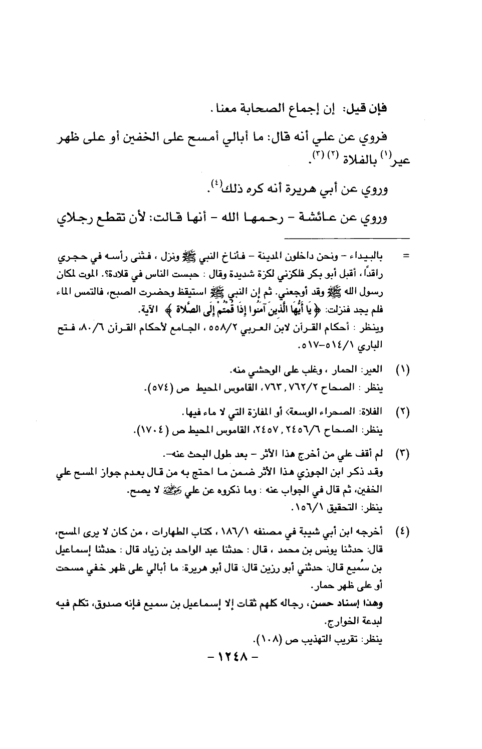فروي عن علي أنه ابن القاسم: ما أبالي أمسح على الخفين أو على ظهر عير بالفلاة.