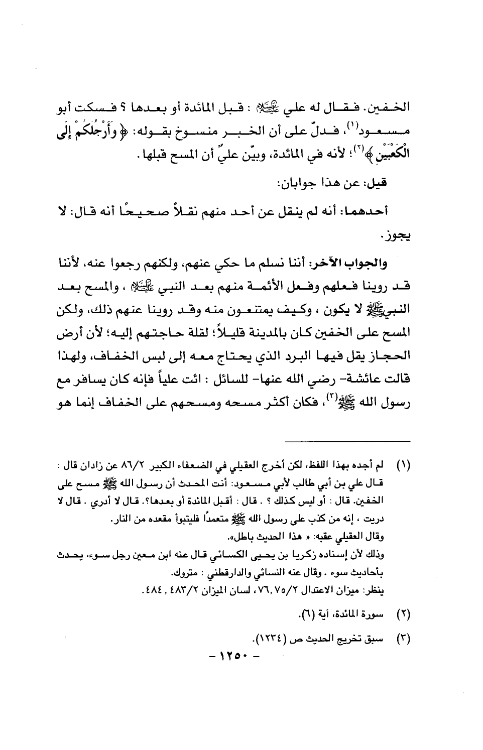 والجواب الآخر: أننا نسلم ما حكي عنهم، ولكنهم رجعوا عنه، لأننا قد روينا فعلهم وفعل الأئمة منهم عبد النبي عليه السلام، والمسح بعد النبي صَلَّى اللَّهُ عَلَيْهِ وَسَلَّمَ لا يكون، وكيف يمتنعون منه وقد روينا عنهم ذلك، ولكن المسح على الخفين كان بالمدينة قليلا؛ لقلة حاجتهم إليه؛ لأن أرض الحجاز يقل فيها الرد الذي يحتاج معه إلى لبس الخفاف، ولهذا قالت عائشة - رضي الله عنها - للسائل ائت عليا فإنه أن يسافر مع رسول الله صَلَّى اللَّهُ عَلَيْهِ وَسَلَّمَ، فكان أكثر مسحه ومسحهم على الخفاف إنما هو
