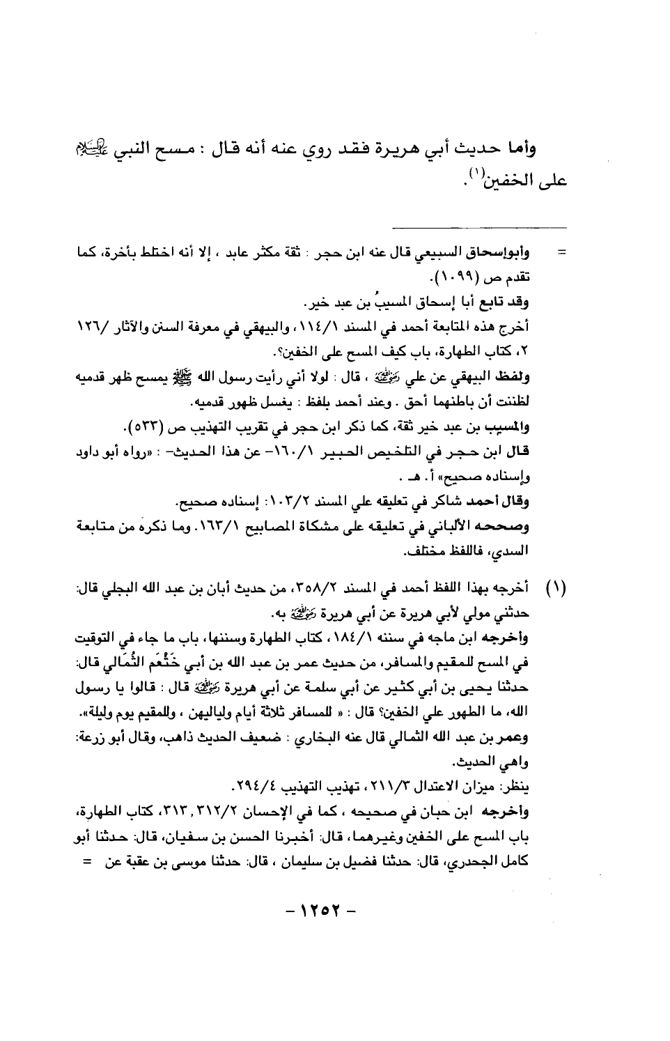 وأما حديث أبي هريرة فقد روي عنه أنه قال: مسح النبي عليه السلام على الخفين.