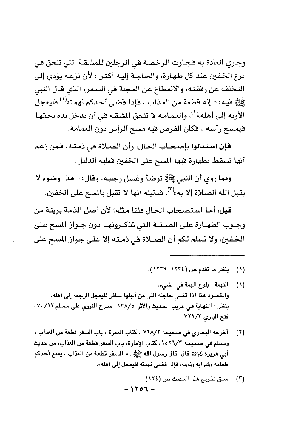 وجرى العادة به فجازت الرخصة في الرجلين للمشقة التي تلحق في نزع الخفين عند كل طهارة، والحاجة إليه أكثر؛ لأن نزعه يؤدي إلى التخلف عن رفقته، والانقطاع عن العجلة في السفر، الذي قال النبي صَلَّى اللَّهُ عَلَيْهِ وَسَلَّمَ فيه: «إنه قطعة من العذاب، فإذا قضى أحدكم نهمته فليعجل الأوبة إلى أهله»، والعمامة لا تلحق المشقة في أن يدخل يده تحتها فيمسح رأسه، فكان الفرض فيه مسح الرأس دون العمامة.