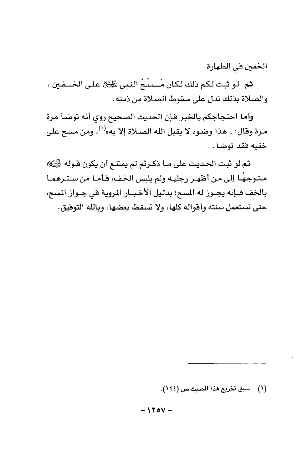 وأما احتجاجكم بالخبر فإن الحديث الصحيح روي أنه توضأ مرة مرة وقال: «هذا وضوء لا يقبل الله الصلاة إلا به»، ومن مسح على خفيه فقد توضأ.