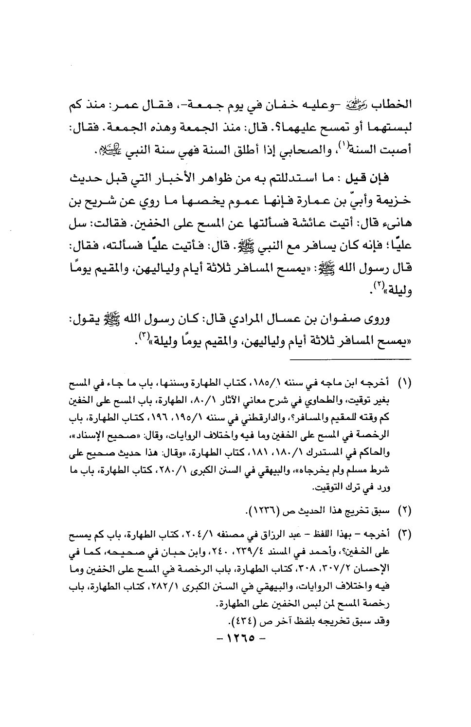 الخطاب رضي الله عنه - وعليه خفان في يوم الجمعة -، فقال عمر: منذ كم لبستهما أو تمسح عليهما؟. قال: منذ الجمعة وهذه الجمعة. فقال: أصبت السنة، والصحابي إذا أطلق السنة فهي سنة النبي صَلَّى اللَّهُ عَلَيْهِ وَسَلَّمَ.