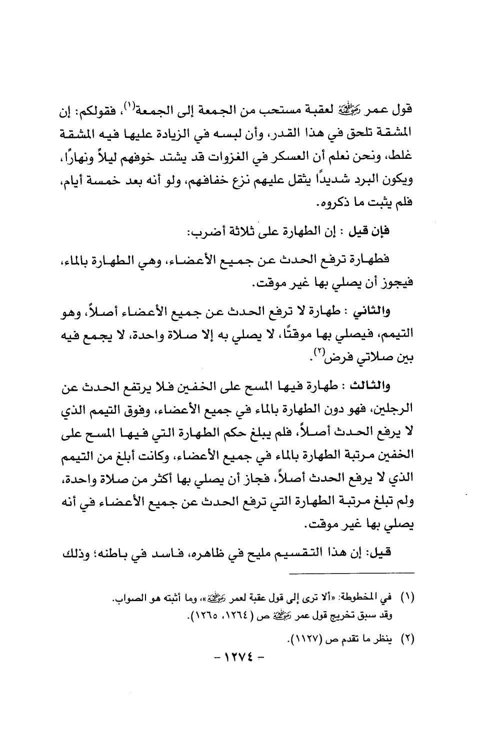 والثالث: طهارة فيها المسح على الخفين فلا يرتفع الحدث عن الرجلين، فهو دون الطهارة بالماء في جميع الأعضاء، وفوق التيمم الذي لا يرفع الحدث أصلا، فلم يبلغ حكم الطهارة التي فيها المسح على الخفين مرتبة الطهارة بالماء في جميع الأعضاء، وكانت أبلغ من التيمم الذي لا يرفع الحدث أصلا، فجاز أن يصلي بها أكثر من صلاة واحدة، ولم تبلغ مرتبة الطهارة التي ترفع الحدث عن جميع الأعضاء في أنه يصلي بها غير موقت.