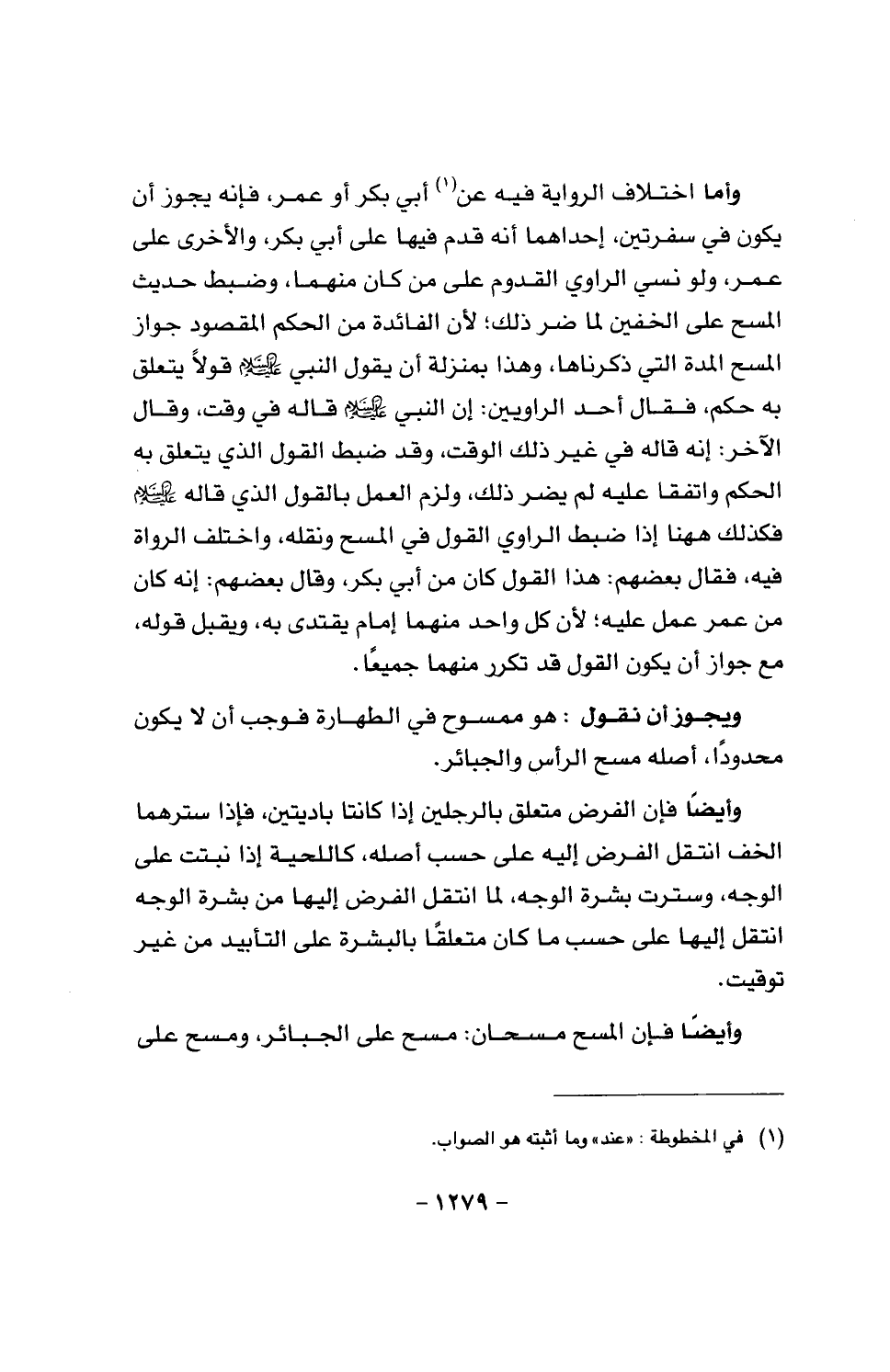 وأما اختلاف الرواية فيه عن أبي بكر أو عمر، فإنه يجوز أن يكون في سفرتين، إحداهما أنه قدم فيها على أبي بكر، والأخرى على عمر، ولو نسي الراوي القدوم على من كان منهما، وضبط حديث المسح على الخفين لما ضر ذلك؛ لأن الفائدة من الحكم المقصود جواز المسح المدة التي ذكرناها، وهذا بمنزلة أن يقول النبي عليه السلام قولا يتعلق به حكم، فقال أحد الراويين: أن النبي عليه السلام قاله في وقت، وقال الآخر: إنه قاله في غير ذلك الوقت، وقد ضبط القول الذي يتعلق به الحكم واتفقا عليه ولم يضر ذلك، ولزم العمل بالقول الذي قاله عليه السلام فكذلك ها هنا ... إذا ضبط الراوي القول في المسح ونقله، واختلف الرواة فيه، فقال بعضهم: هذا القول كان من أبي بكر، وقال بعضهم: إنه كان من عمر عمل عليه؛ لأن كل واحد منهما إمام يقتدى به، ويقبل قوله، مع جواز أن يكون القول قد تكرر منهما جميعا.