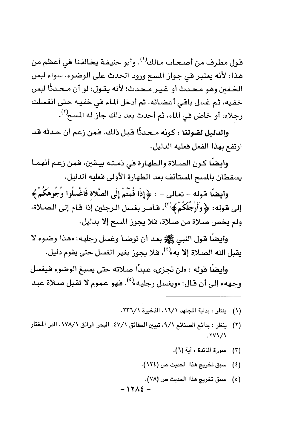 وأيضا كون الصلاة والطهارة في ذمته بيقين، فمن زعم أنهما يسقطان بالمسح المستأنف بعد الطهارة الأولى فعليه الدليل.