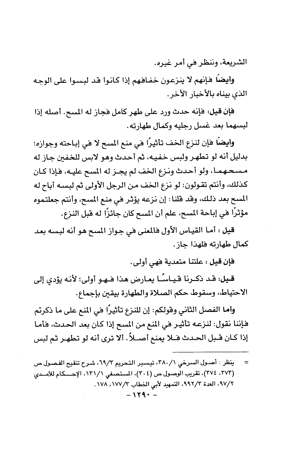 وأما الفصل الثاني وقولكم: إن للنزع تأثيرا في المنع على ما ذكرتم فإننا نقول: لنزعه تأثيرا في المنع من المسح إذا كان بعد الحديث، فأما إذا كان قبل الحدث فلا يمنع أصلا. ألا ترى أنه لو تطهر ثم لبس