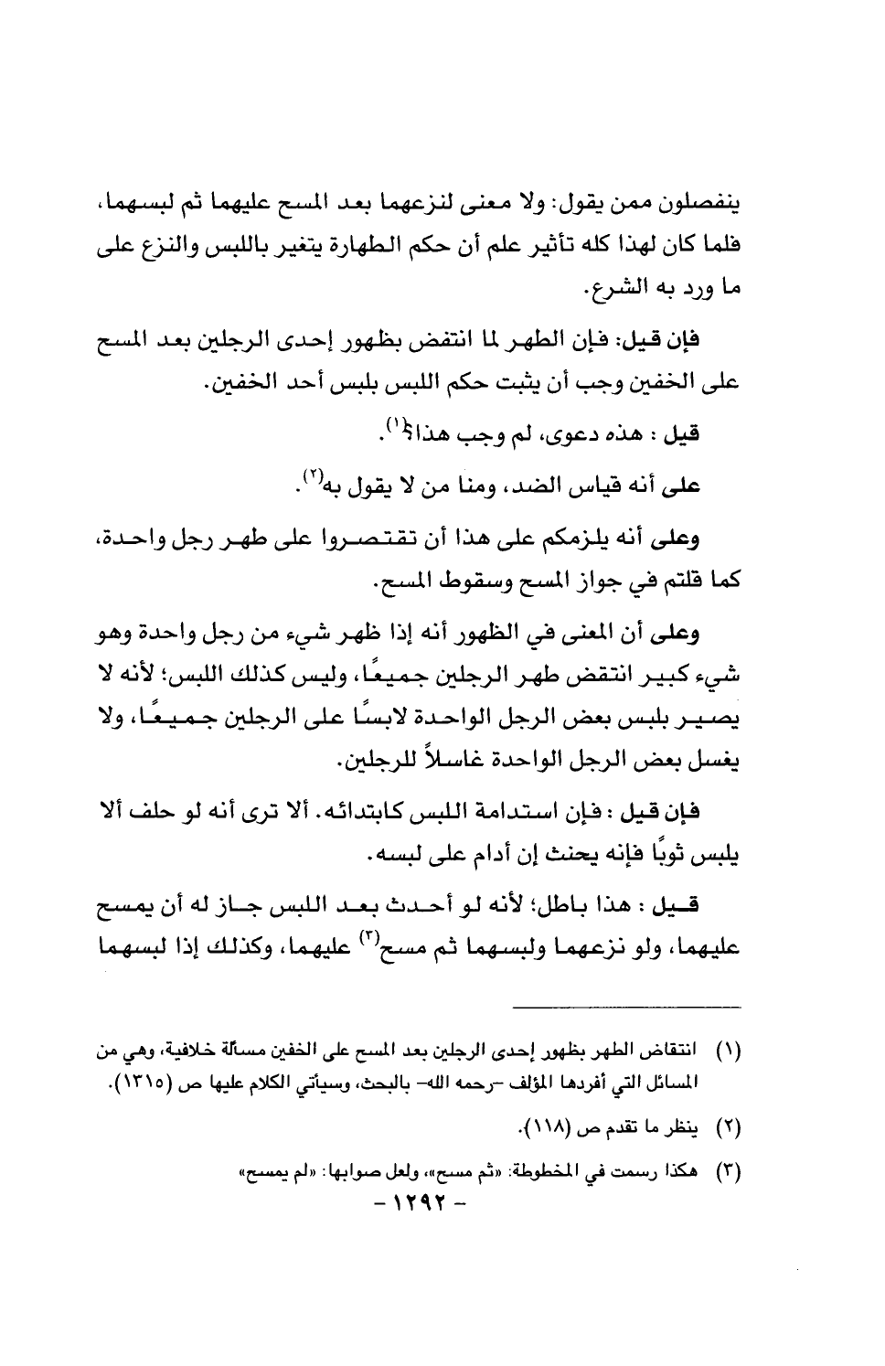 وعلى أنه يلزمكم على هذا أن تقتصروا على طهر رجل واحدة، كما قلتم في جواز المسح وسقوط المسح.
