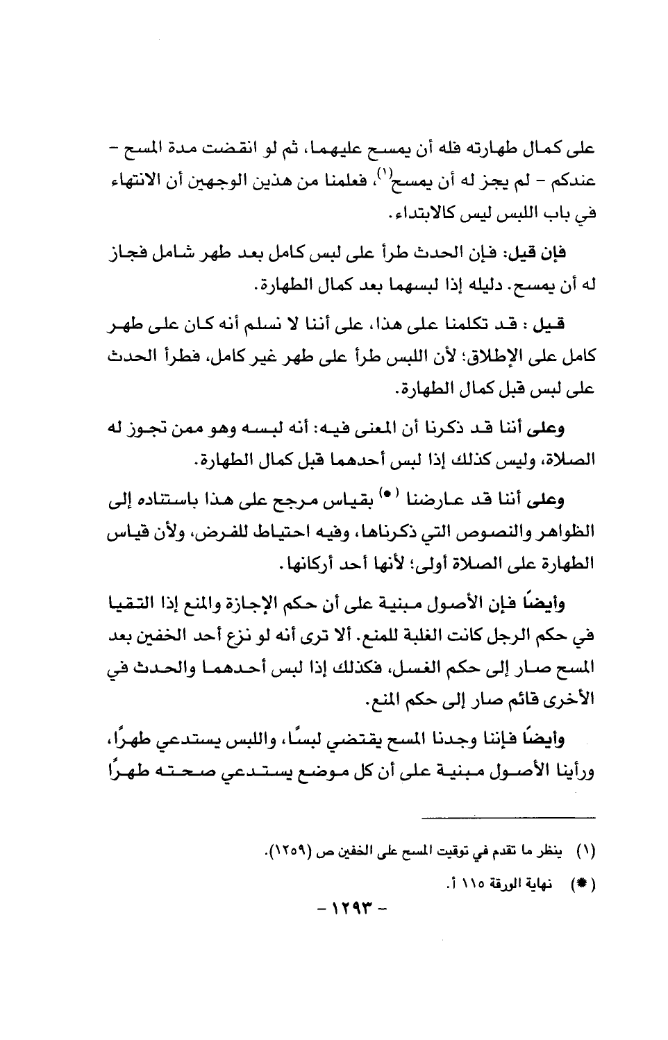 وأيضا فإننا وجدنا المسح يقتضي لبسا، واللبس يستدعي طهرا، ورأينا الأصول مبنية على أن كل موضع يستدعي صحته طهرا