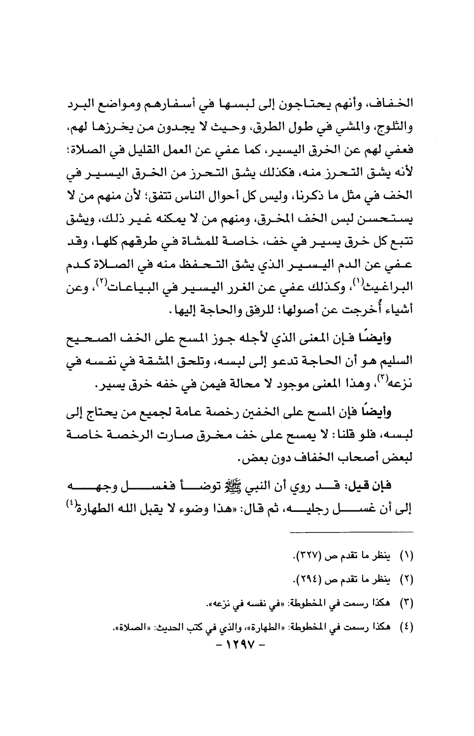 وأيضا فإن المعنى الذي لأجله جوز المسح على الخف الصحيح السليم هو أن الحاجة تدعو إلى لبسه، وتلحق المشقة في نفسه في نزعه، وهذا المعنى موجود لا محالة فيمن في خفه خرق يسير.