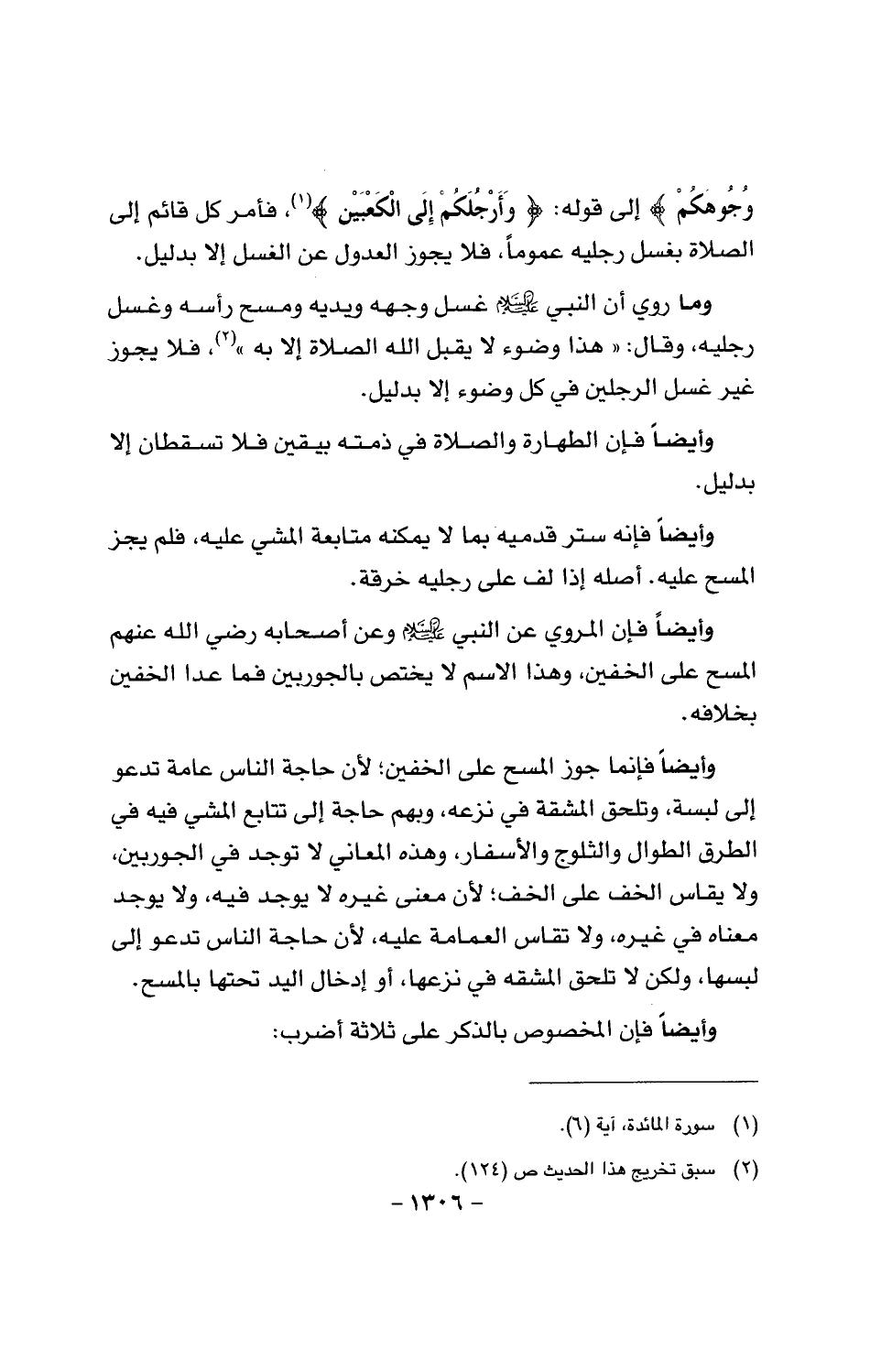 وأيضا فإنما جوز المسح على الخفين؛ لأن حاجة الني عامة تدعو إلى لبسة، وتلحق المشقة في نزعه، وبهم حاجة إلى تتابع المشي فيه في الطرق الطلا والثلوج والأسفار، وهذا المعاني لا توجد في الجوربين، ولا يقاس الخف على الخف؛ لأن معنى غيره لا يوجد فيه، لا يوجد معناه في غيره، ولا تقاس العمامة عليه، لأن حاجة الناس تدعو إلى لبسها، ولكن لا تلحق المشقة في نزعها، أو إدخال اليد تحتها بالمسح.