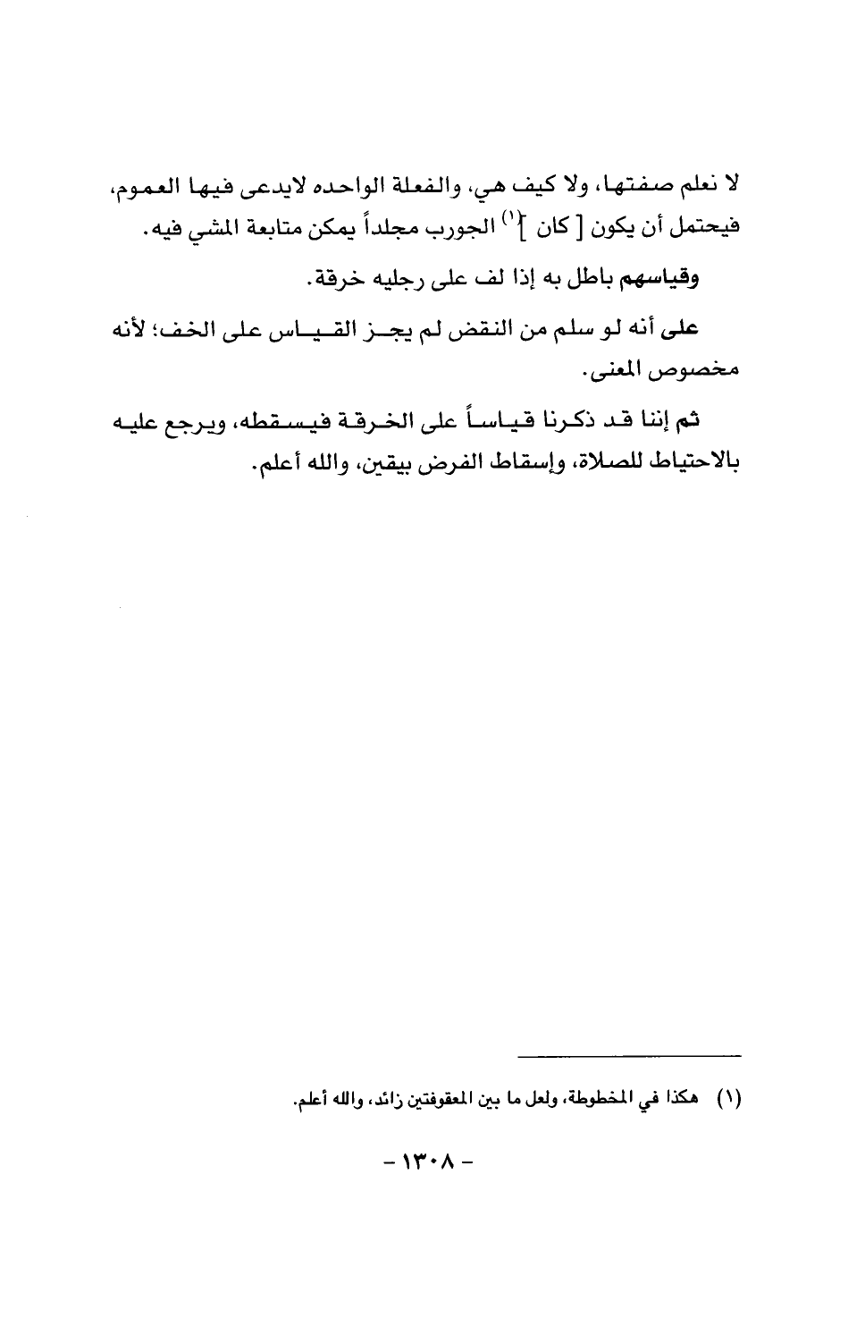 لا نعلم صفتها، ولا كيف هي، والفعلة الواحدة لا يدعي فيها العموم، فيحتمل أن يكو [كان] الجورب مجلدا يمكن متابعة الشيء فيه.