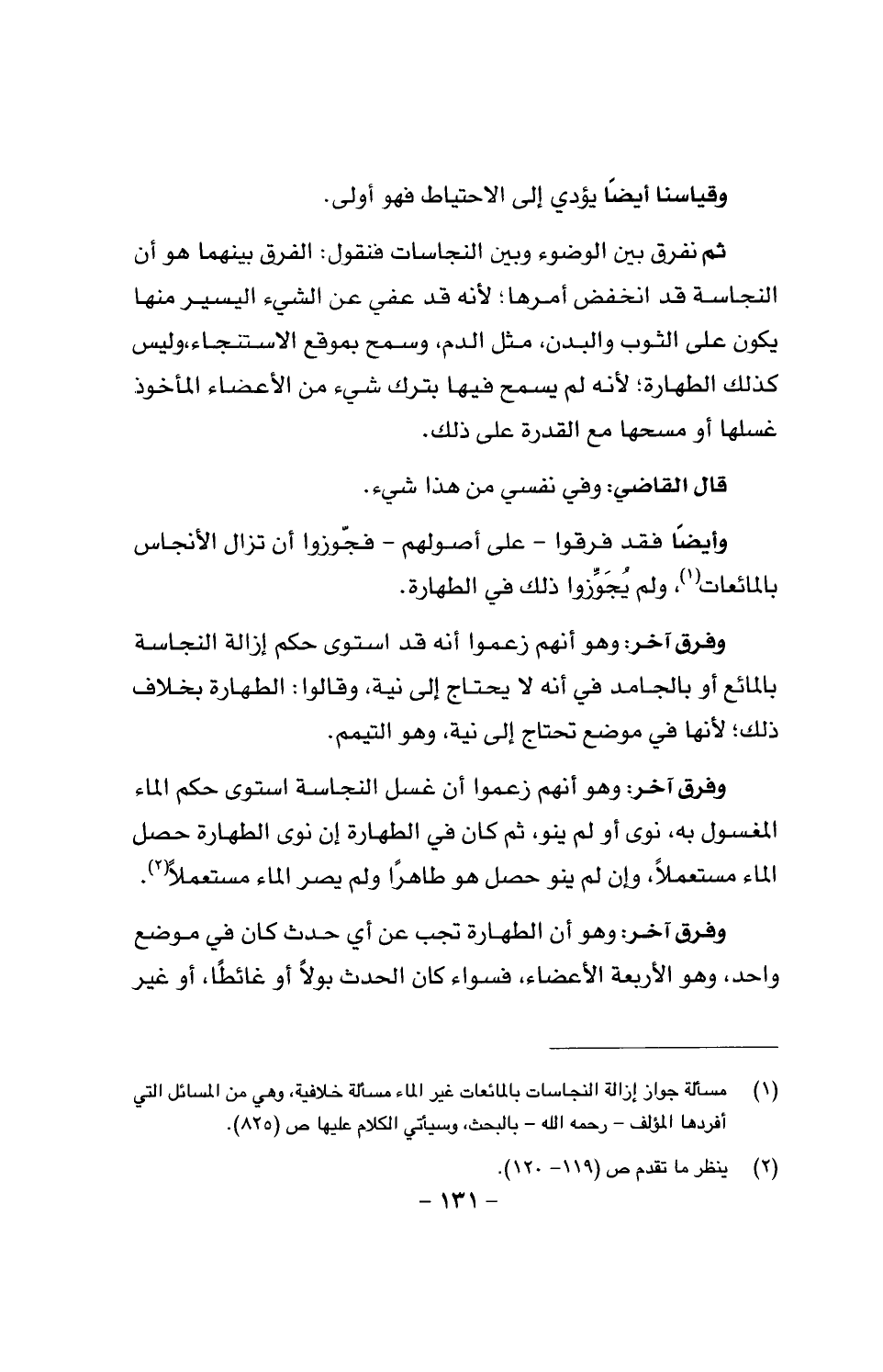 ثم تفرق بين الوضوء وبين النجاسات فنقول: الفرق بينهما هو أن النجاسة قد انخفض أمرها؛ لأنَّه قد عفي عن الشيء اليسير منها يكون على الثوب والبدن، مثل الدم، وسمح بموقع الاستنجاء، وليس كذلك الطهارة؛ لأنَّه لم يسمح فيها بترك شيء من الأعضاء المأخوذ غسلها أو مسحها مع القدرة على ذلك.