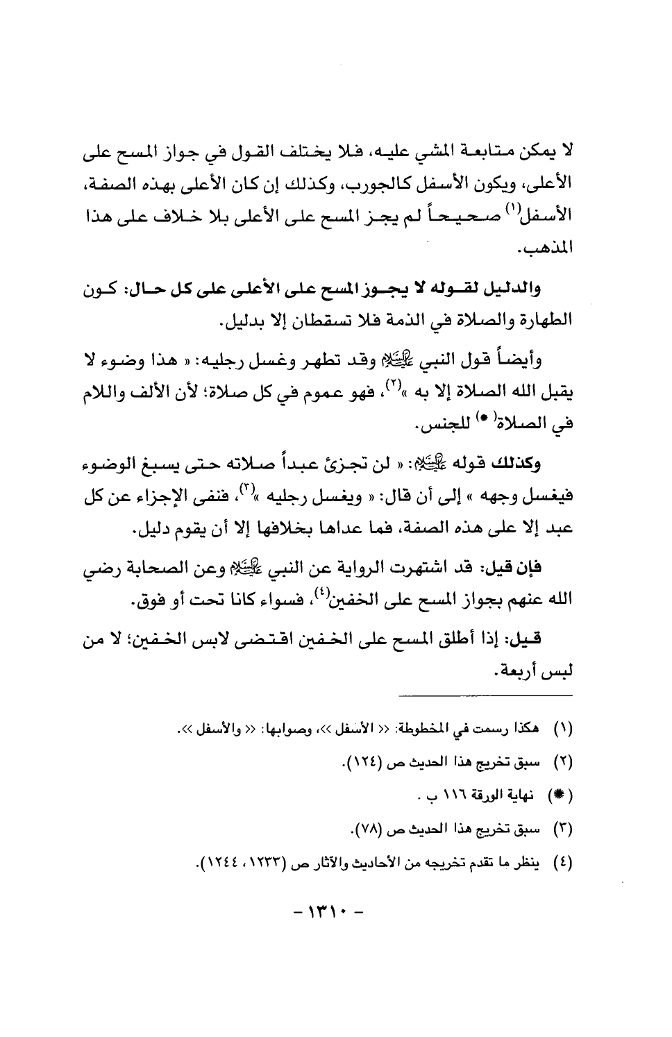 الدليل لقوله لا يجوز المسح على الأعلى على كل حال: كون الطهارة والصلاة في الذمة فلا تسقطان إلا بدليل.