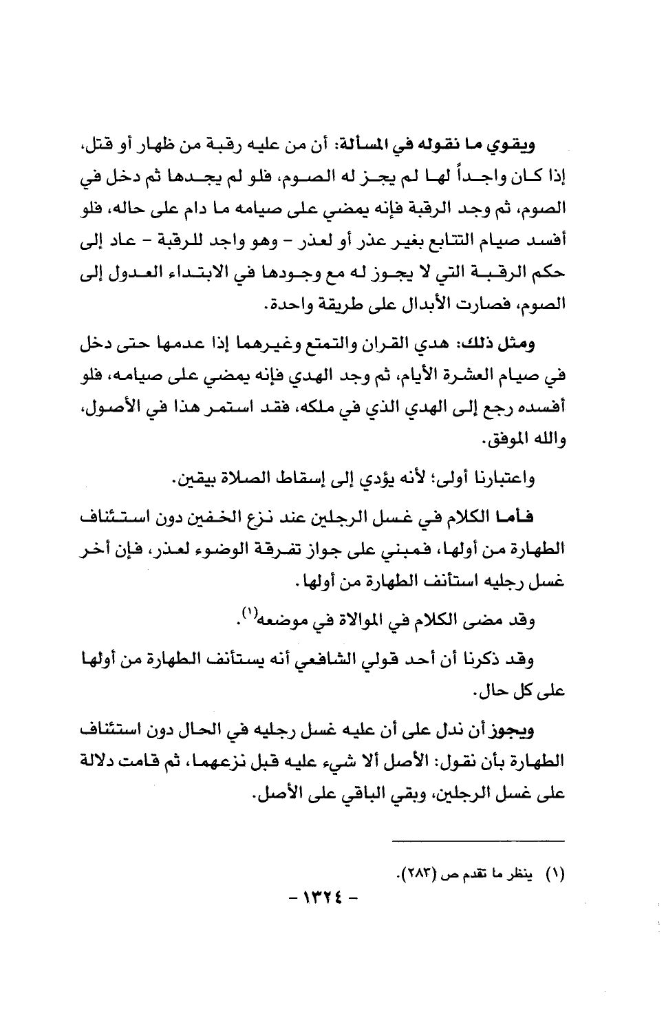 ويقوي ما نقوله في المسألة: أن من عليه رقبة من ظهار أو قتل، إذا كان واجدا لها لم يجز له الصوم، فلو لم يجدها ثم دخل في الصوم، ثم جد الرقبة فإنه يمضي على صيامه ما دام على حاله، فلو أفسد صيام التتابع بغير عذر أو لعذر - وهو واجد للرقبة - عاد إلى حكم الرقبة التي لا يجوز له مع وجودها في الابتداء العدول إلى الصوم، فصارت الأبدال على طريقة واحدة.