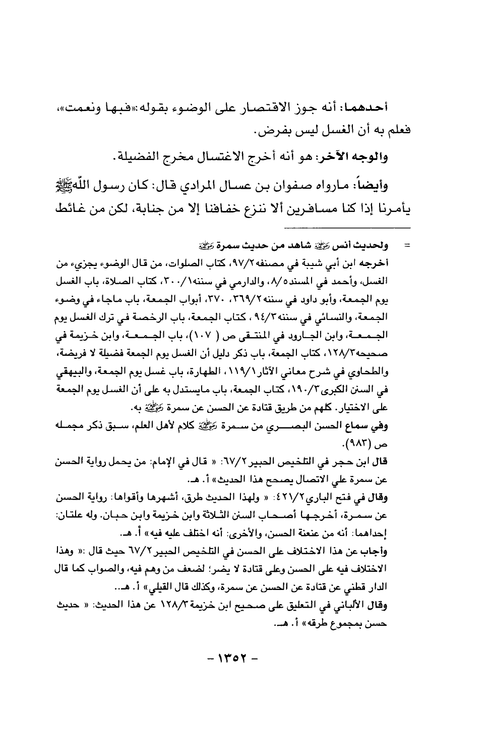 وأيضا: ما رواه صفوان بن عسال المرادي قال: كان رسول الله صَلَّى اللَّهُ عَلَيْهِ وَسَلَّمَ يأمرنا إذا كنا مسافرين ألا ننزع خفافنا إلا من جنابة، لكن من غائط.