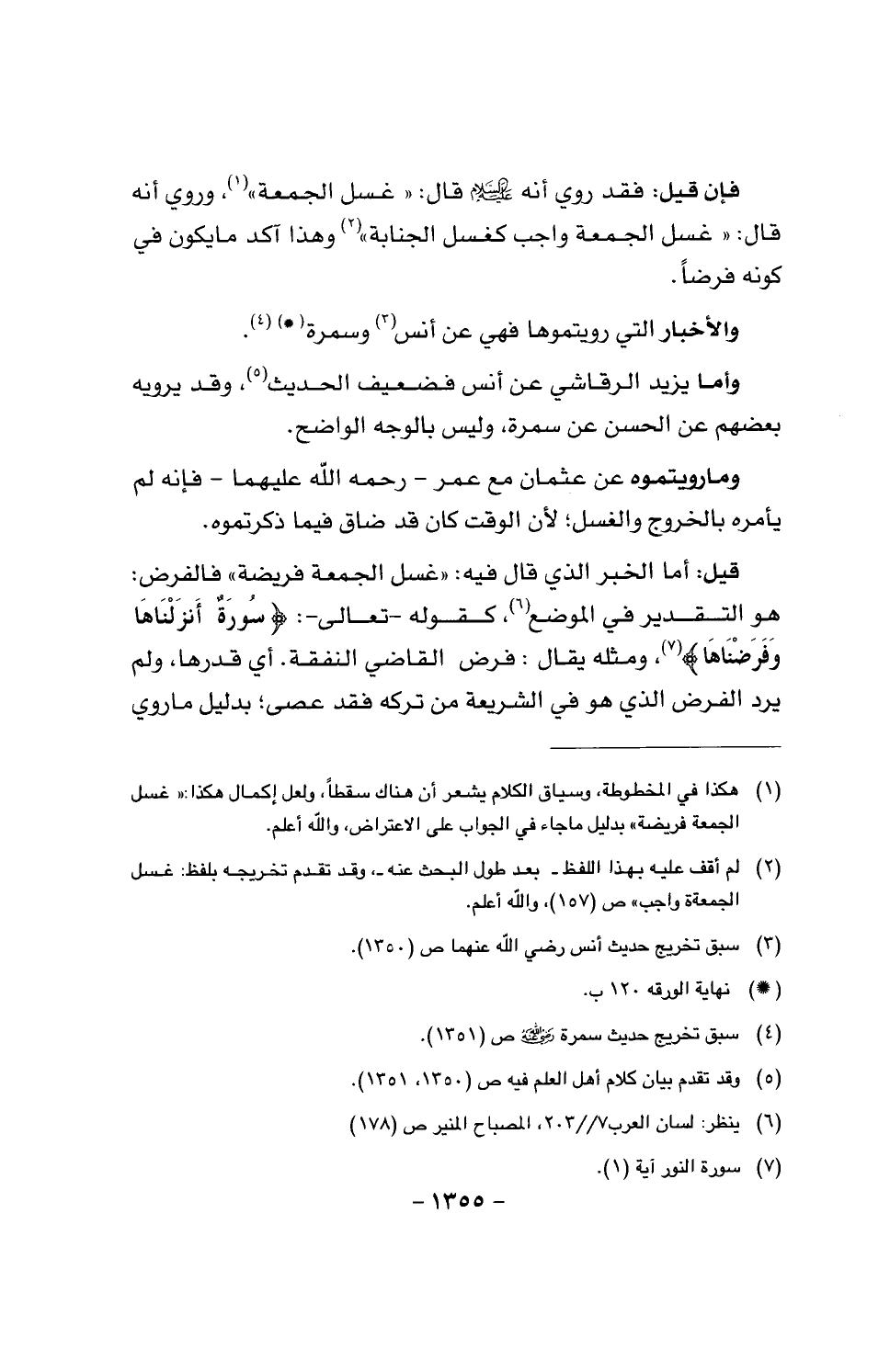 قيل: أما الخبر الذي قال فيه: «غسل الجمعة فريضة» فالفرض: هو التقدير في الموضع، كقوله - تعالى -: {سورة أنزلناها وفرضناها}، ومثله يقال: فرض القاضي النفقة، أي قدرها، ولم يرد الفرض الذي هو في الشريعة من تركه فقد عصى؛ بدليل ما روي