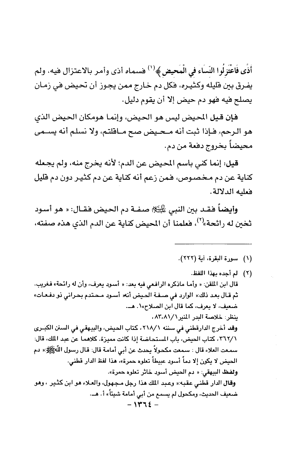 وأيضا فقد بين النبي عليه السلام صفة دم الحيض فقال: «هو أسود ثخين له رائحة»، فعلمنا أن المحيض كناية عن الدم الذي هذه صفته،