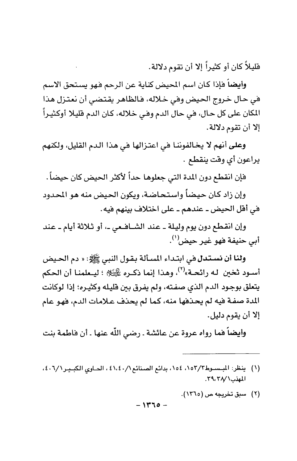 ولنا أن نستدل في ابتداء المسألة بقول النبي صَلَّى اللَّهُ عَلَيْهِ وَسَلَّمَ: «دم الحيض أسود ثخين له رائحة»، وهذا إنما ذكره عليه السلام؛ ليعلمنا أن الحكم بتعلق بوجود الدم الذي صفته، ولم يفرق بين قليله وكثيره؛ إذا لو كانت المدة صفة فيه لم يحذفها منه، كما لو يحذف علامات الدم نفه عام إلا أن يقوم دليل.
