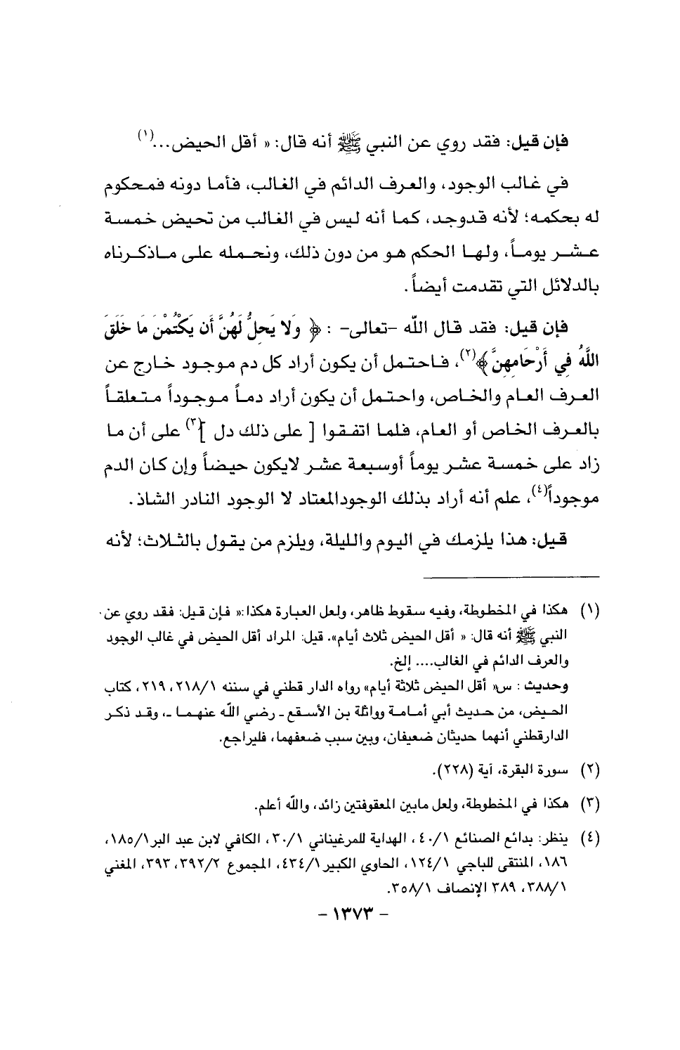 فإن قيل: فقد قال الله - تعالى -: {ولا يحل لهن أن يكتمن ما خلق الله في أرحامهن}، فاحتمل أن يكون أراد كل دم موجود خارج عن العرف العام والخاص، واحتمل أن يكون أراد دما موجودا متعلقا بالعرف الخاص أو العام، فلما اتفقوا [على ذلك دل] على أن ما زاد على خمسة عشر يوما أو سبعة عشر لا يكون حيضا عن كان الدم موجودا، علم أنه أراد بذلك الوجود المعتاد لا الوجود النادر الشاذ.