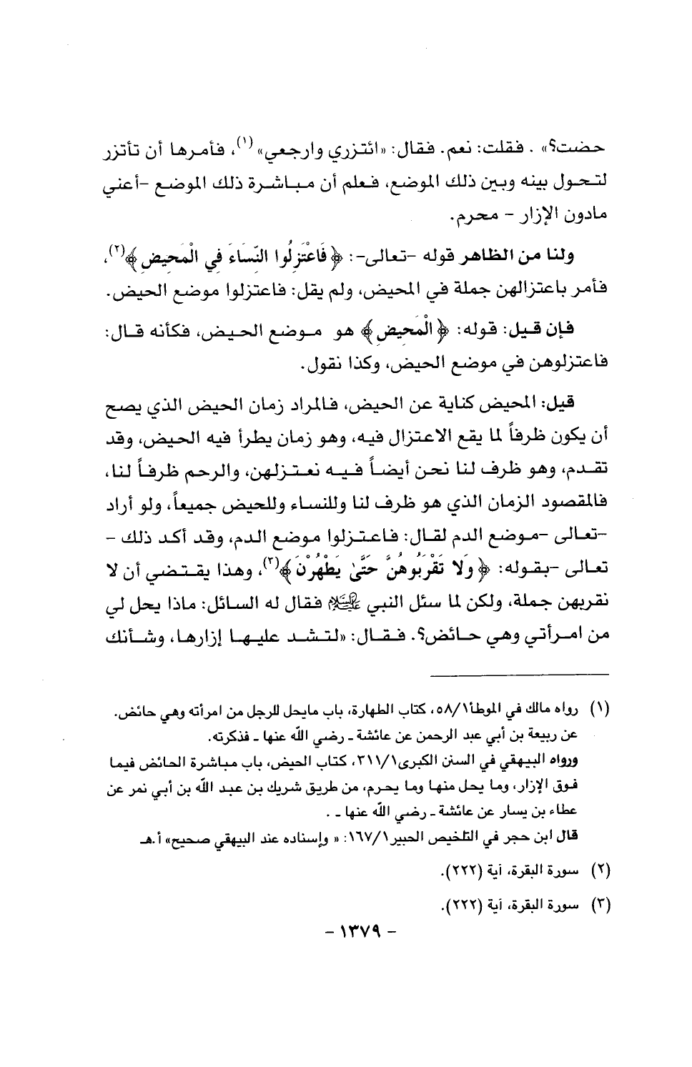 حضت؟». فقلت: نعم. فقال: «ائتزري وارجعي»، فأمرها أن تأتزر لتحول بينه وبين ذلك الموضع، فعلم أن مباشرة ذلك الموضع - اعني ما دون الإزار - محرم.